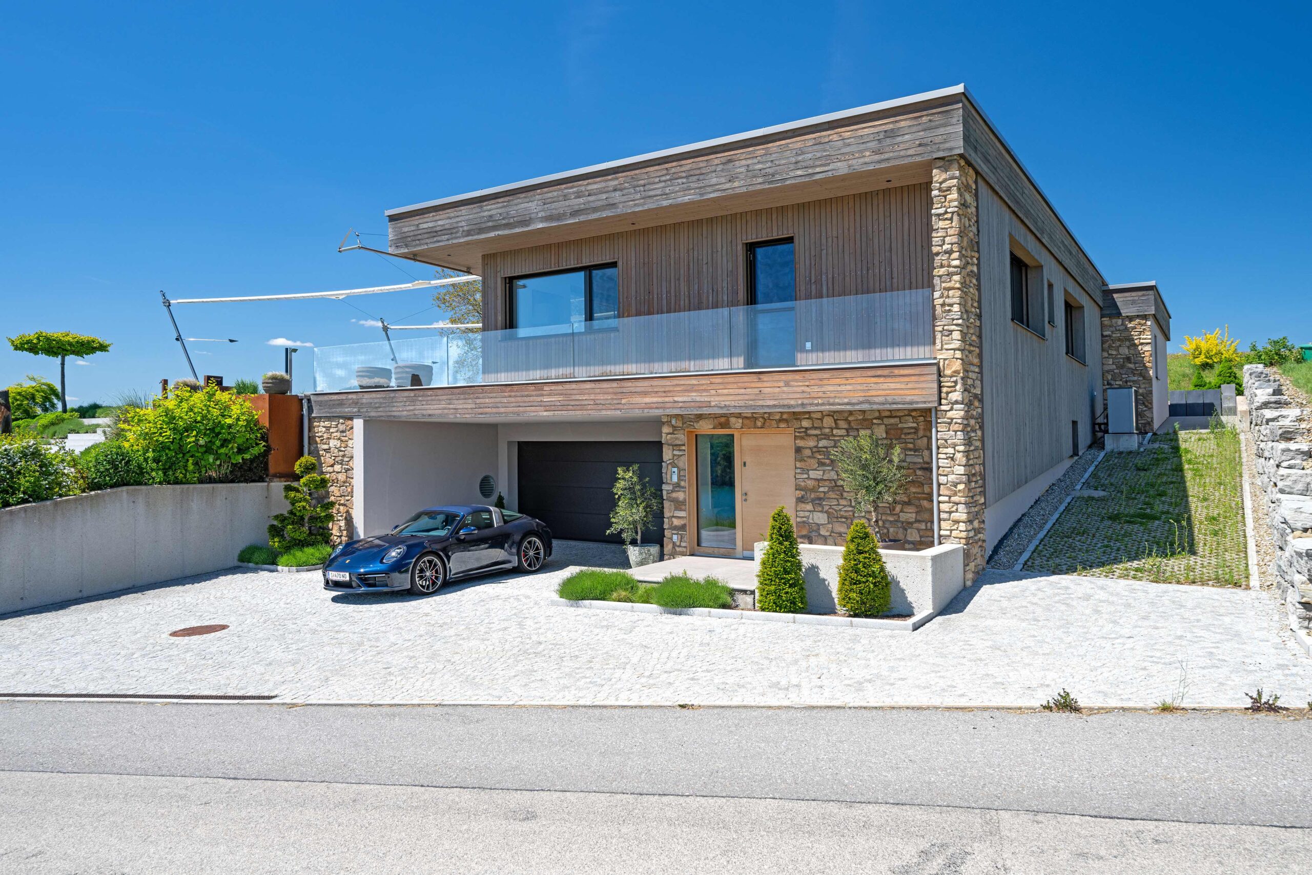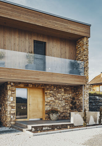 Die Massivbauweise aus Ziegel sorgt für eine stabile, langlebige Konstruktion und optimale Dämmwerte. Die Fassade ist teilweise mit Holzschalung gestaltet, wodurch warme, natürliche Akzente gesetzt werden. Das Flachdach ist begrünt, unterstützt die ökologische Performance des Hauses und erweitert die Außenflächen um einen grünen Akzent. Für die Energieversorgung wurde eine moderne Wärmepumpe integriert, die effizienten, nachhaltigen Wohnkomfort bietet.