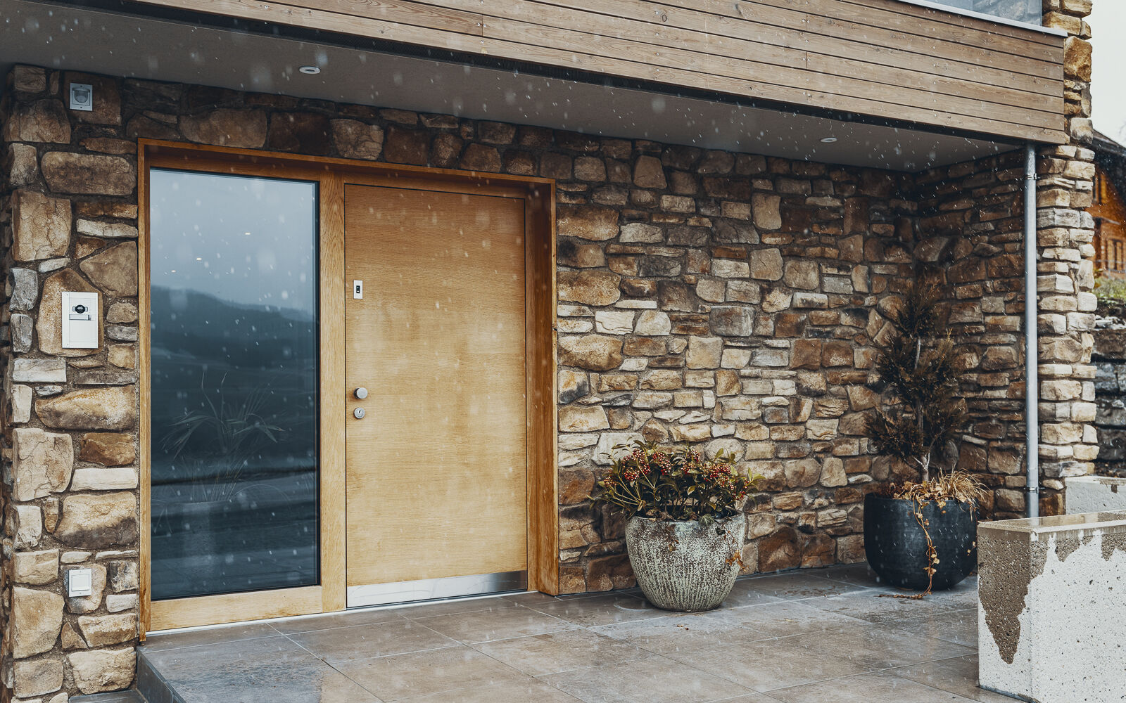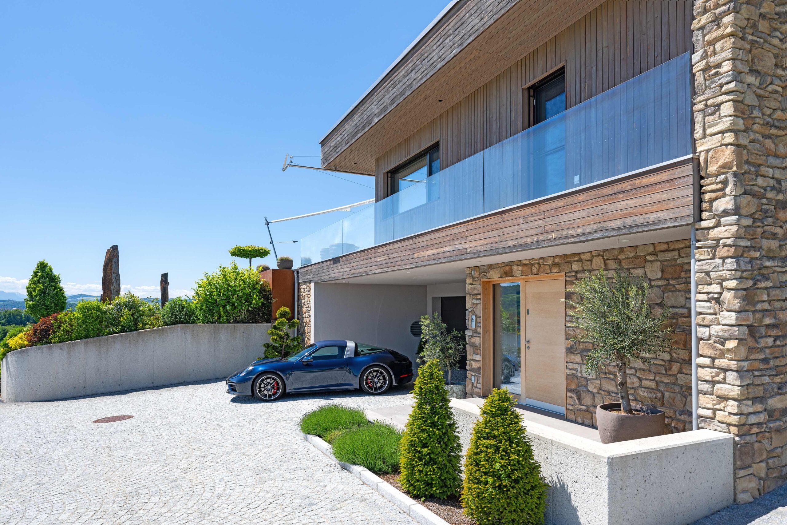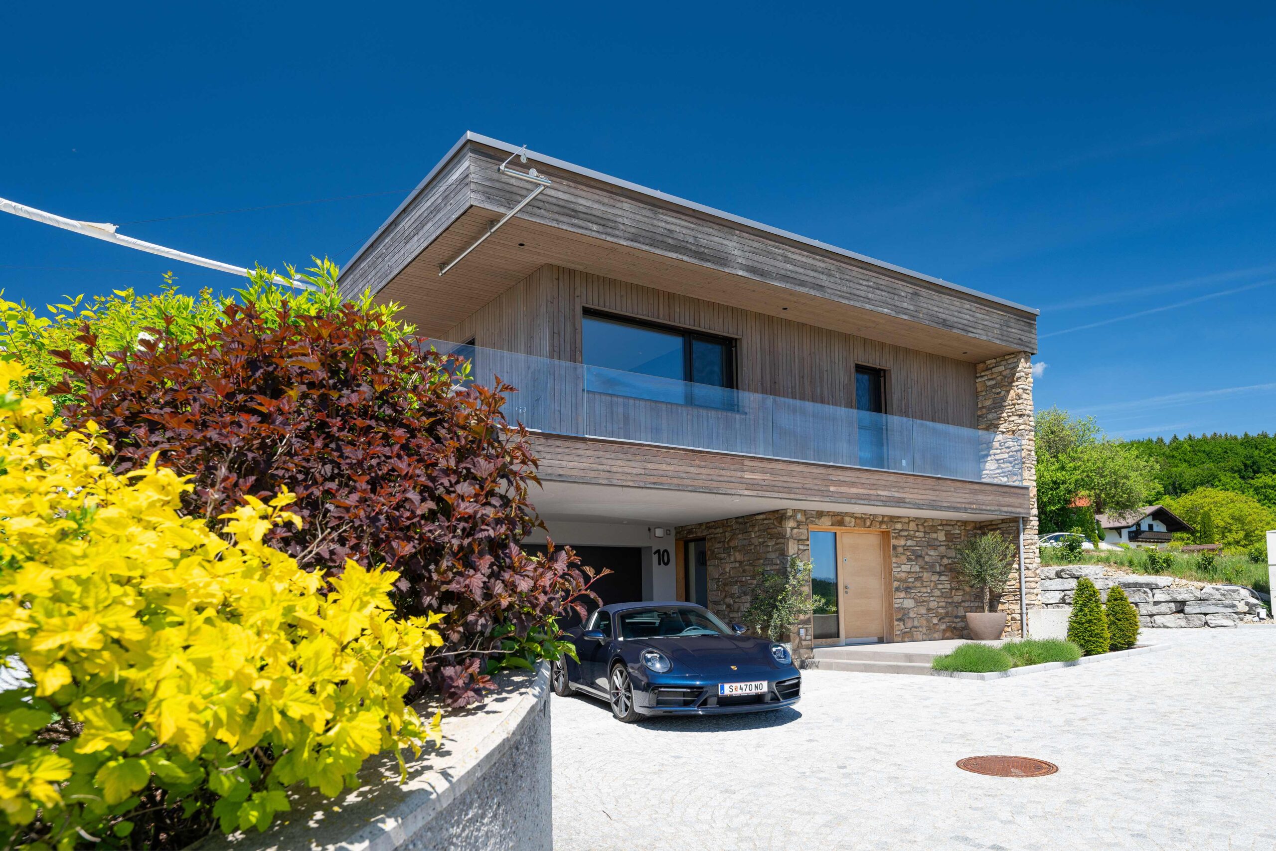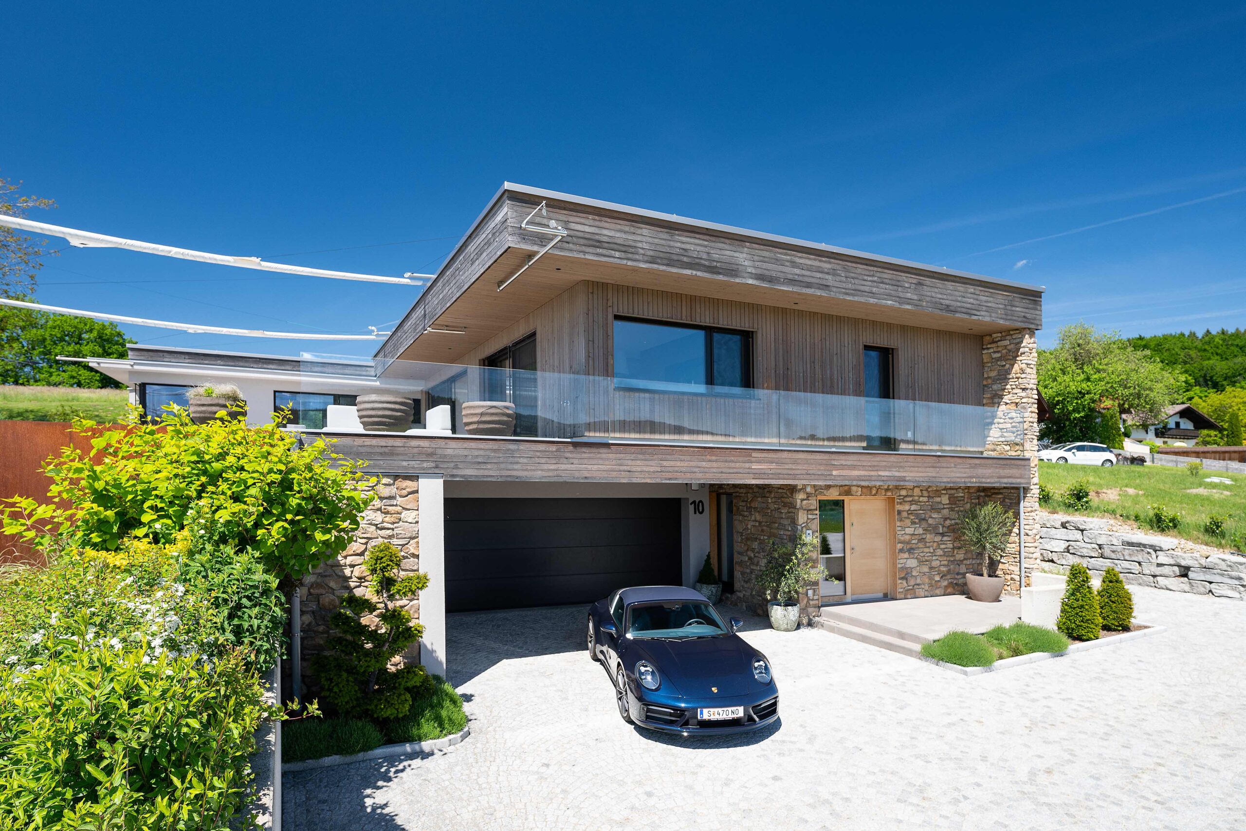 Der Neubau in Lochen am See wurde als moderner Bungalow in Hanglage realisiert. Der Zugang erfolgt über die untere Ebene über eine großzügige Tiefgarage, die Stellplätze für mehrere Fahrzeuge sowie Abstell- und Technikflächen bietet. Von hier gelangt man direkt in die Wohnbereiche, wodurch kurze Wege und ein komfortabler Übergang zwischen Auto und Haus gewährleistet sind.