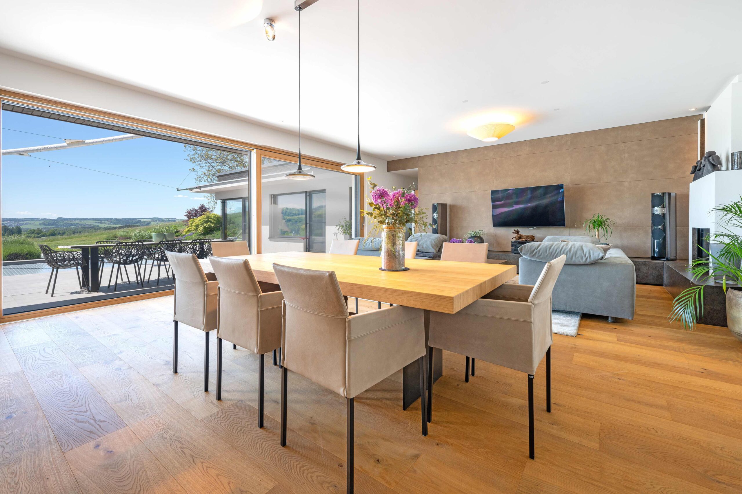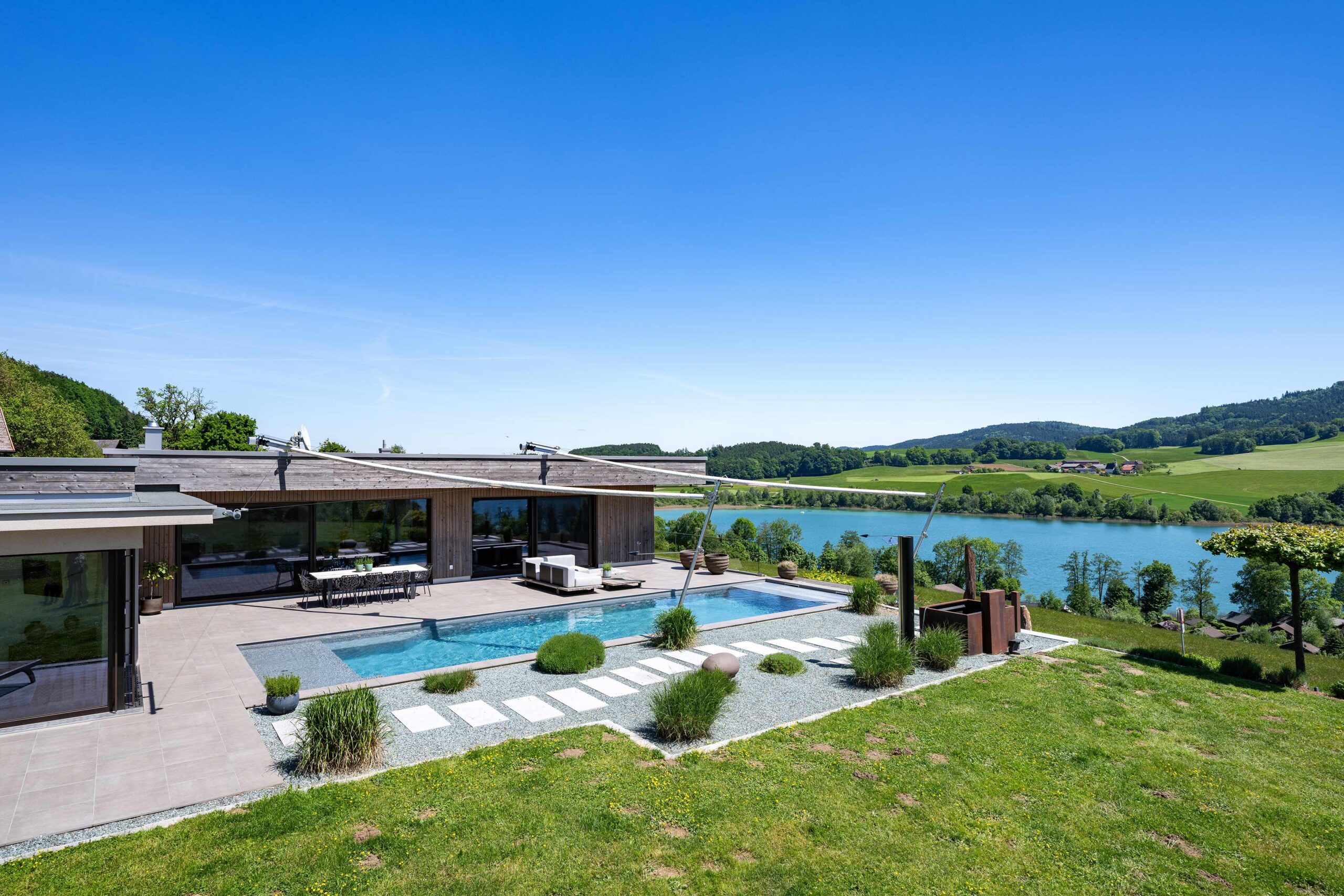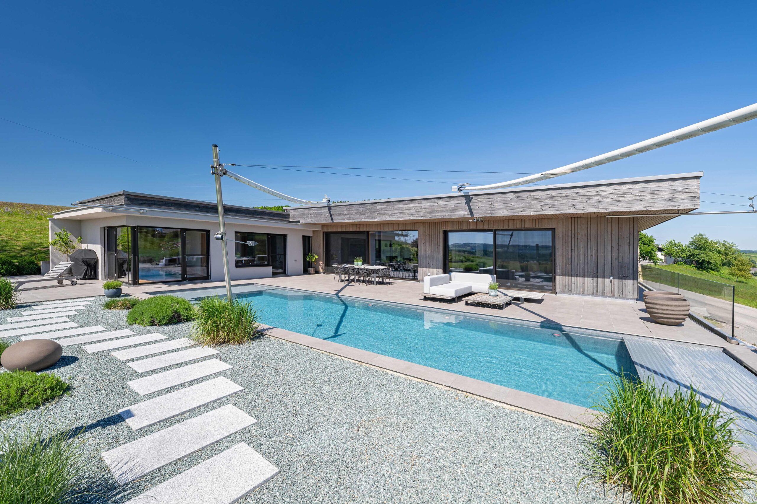 Besonderes Augenmerk liegt auf der Raum- und Lichtführung, die durch die Hanglage, die Terrassenflächen, die Pool-Ausrichtung und die großen Verglasungen zu einem durchgehenden Erlebnis von innen nach außen führt. Barrierefreie Wege auf einer Ebene ermöglichen komfortables Wohnen im Alter, während die Terrassen, Pool und Gartenflächen flexibel genutzt werden können – sowohl für Erholung als auch für geselliges Beisammensein.