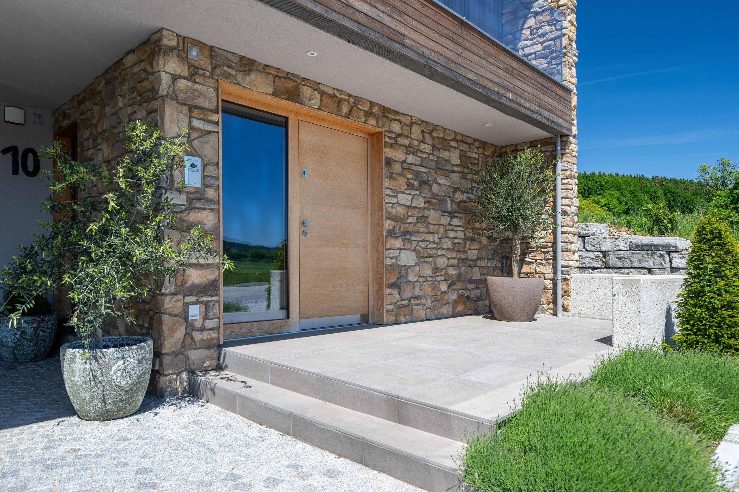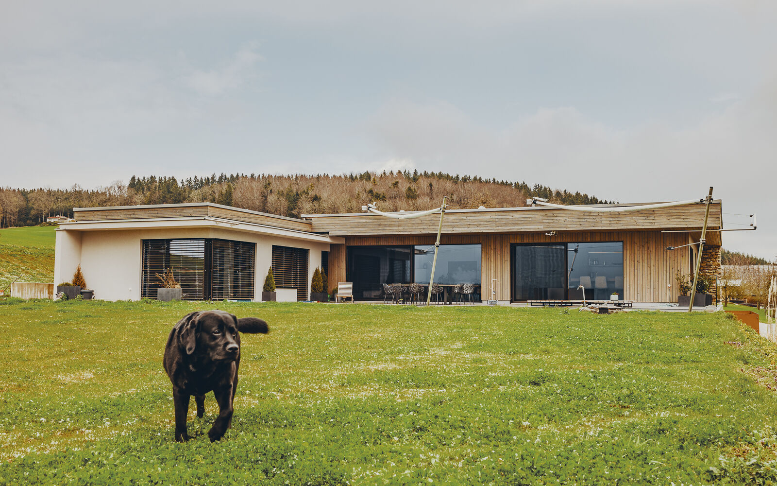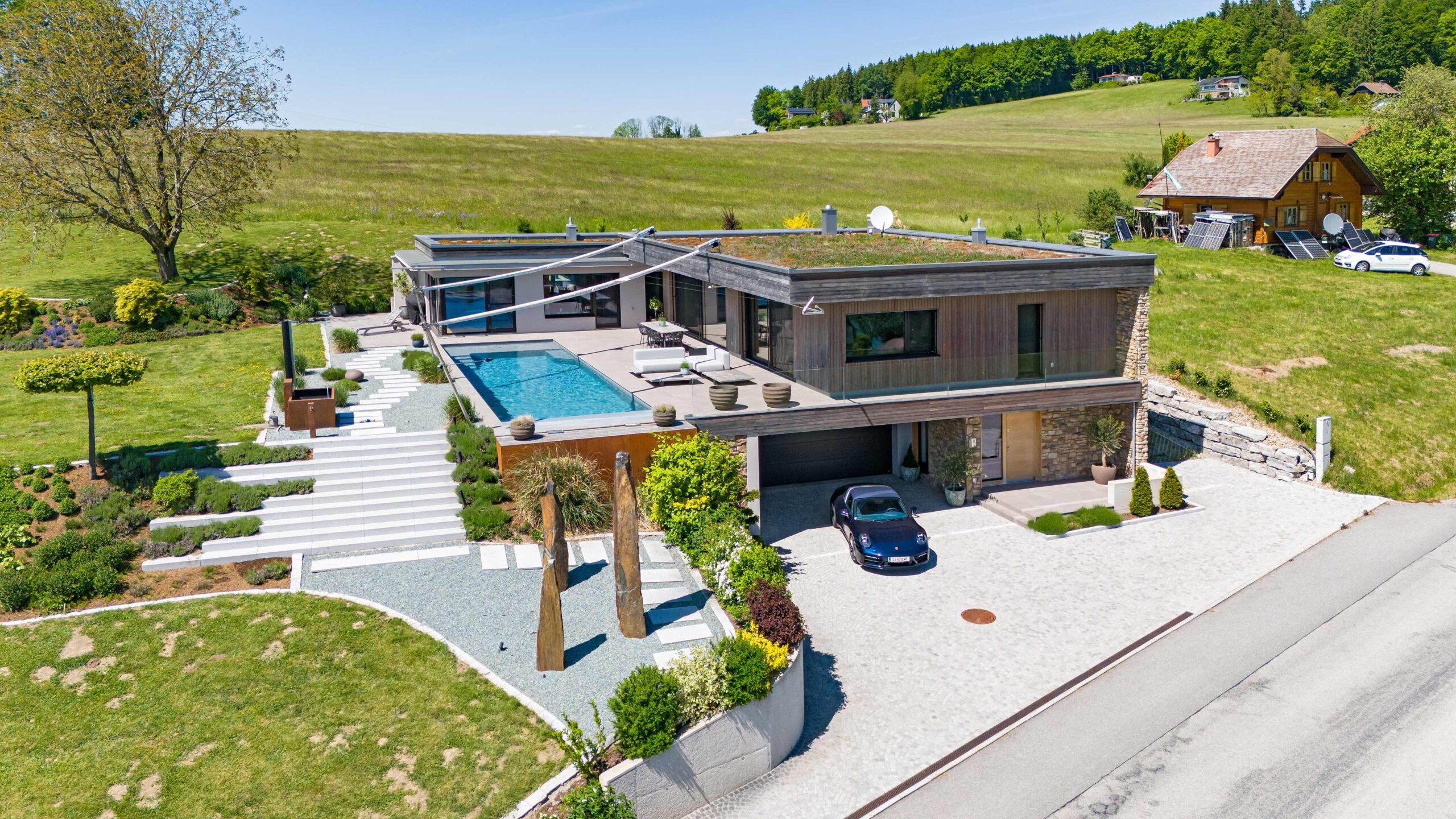 Besonderes Augenmerk liegt auf der Raum- und Lichtführung, die durch die Hanglage, die Terrassenflächen, die Pool-Ausrichtung und die großen Verglasungen zu einem durchgehenden Erlebnis von innen nach außen führt. Barrierefreie Wege auf einer Ebene ermöglichen komfortables Wohnen im Alter, während die Terrassen, Pool und Gartenflächen flexibel genutzt werden können – sowohl für Erholung als auch für geselliges Beisammensein.