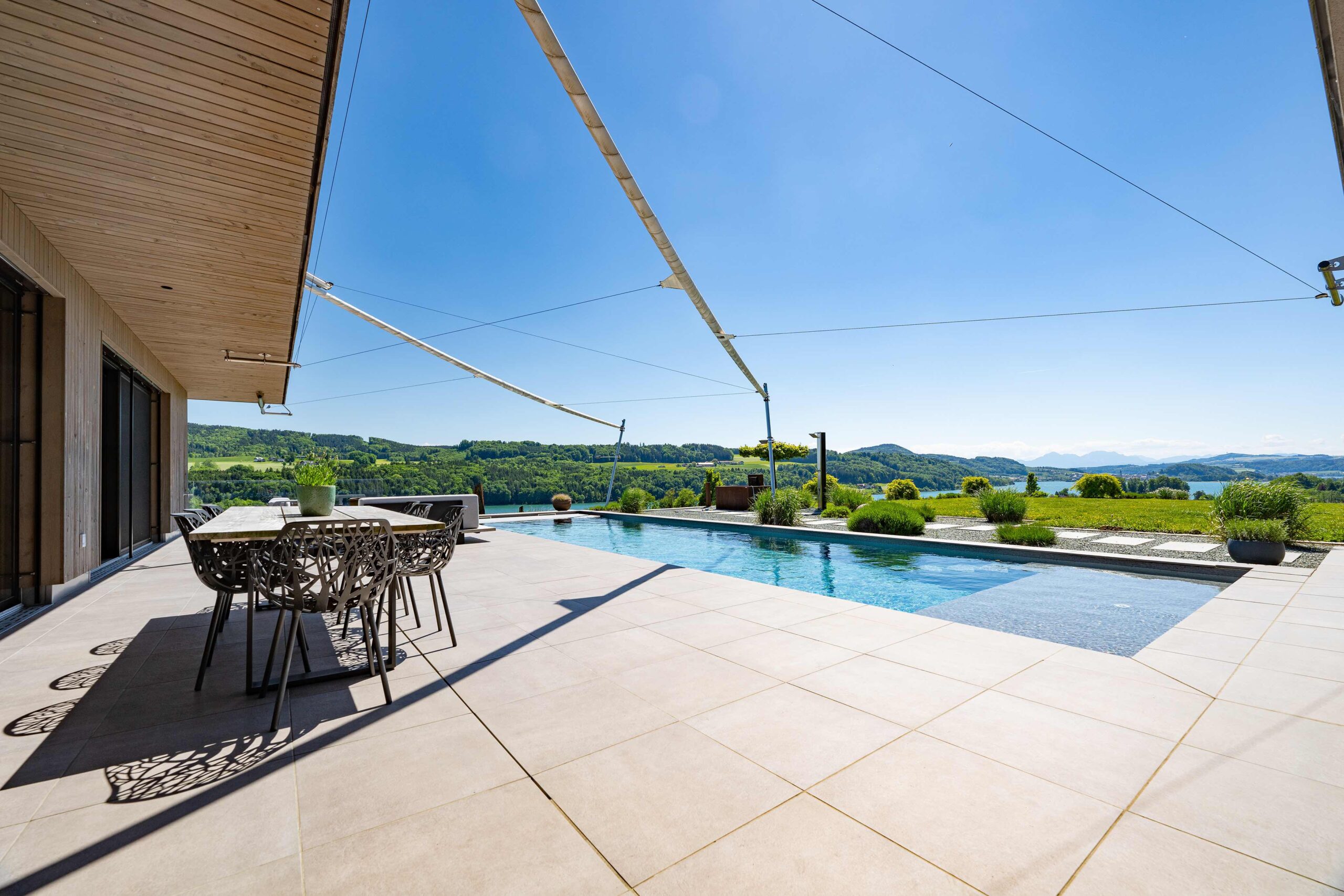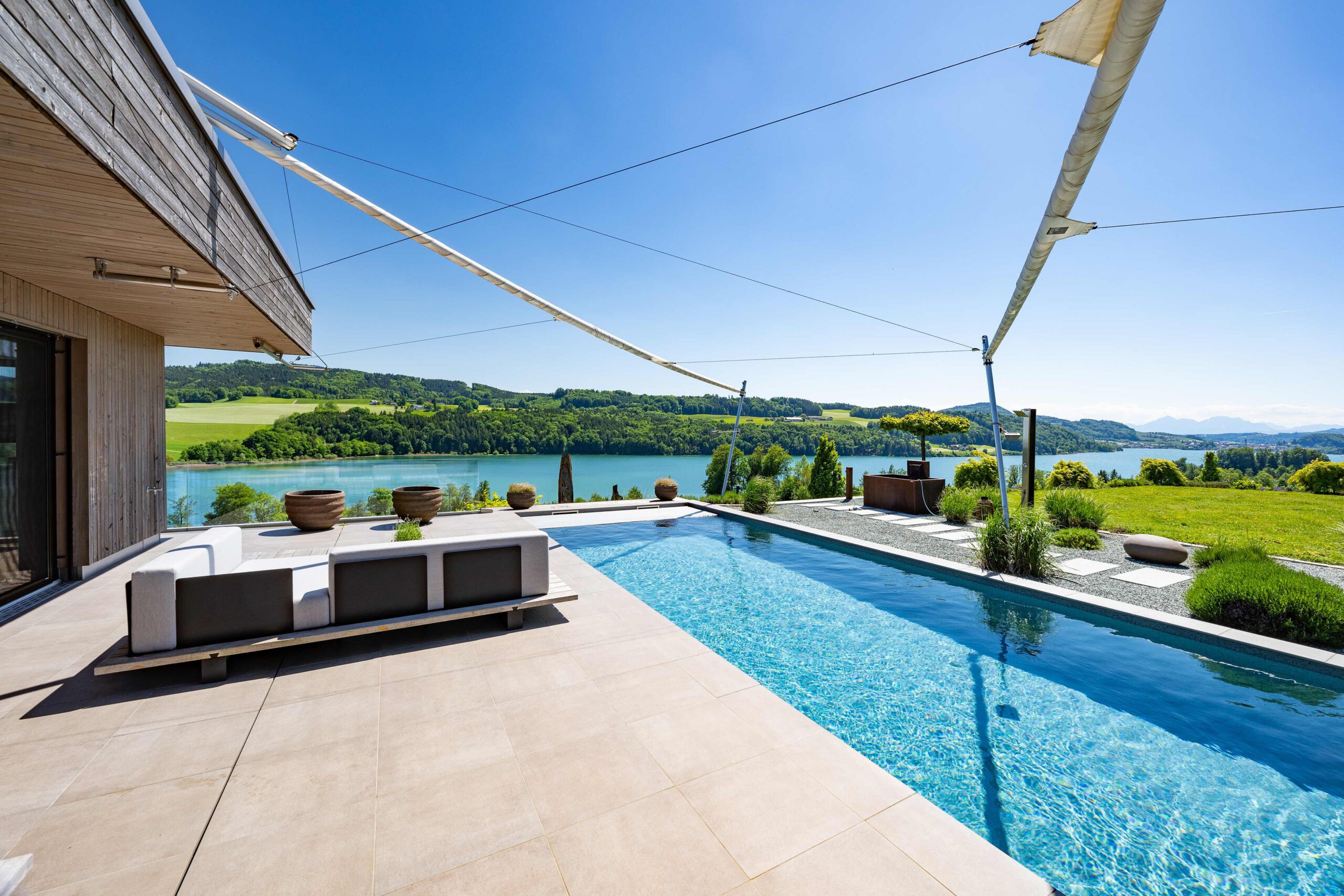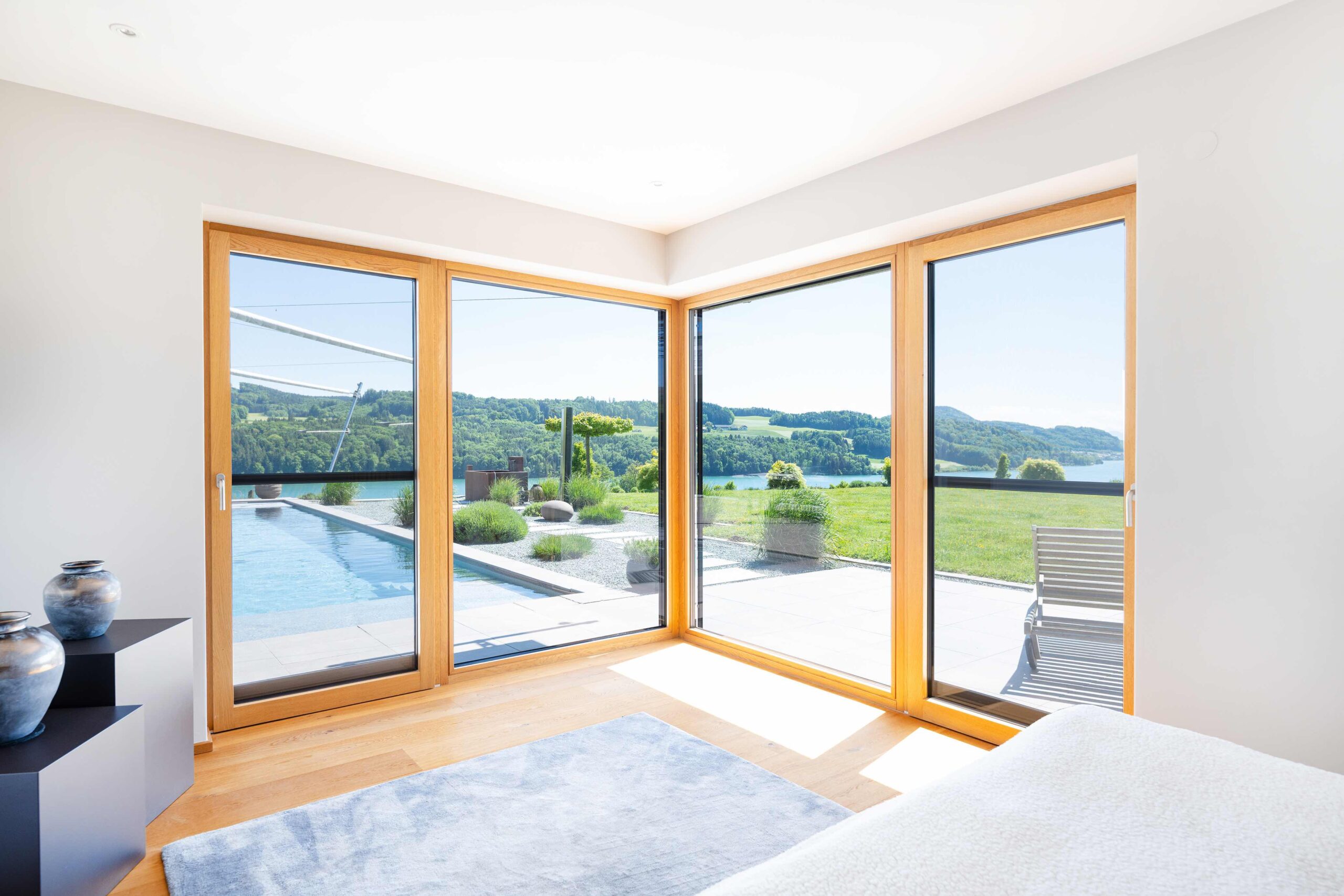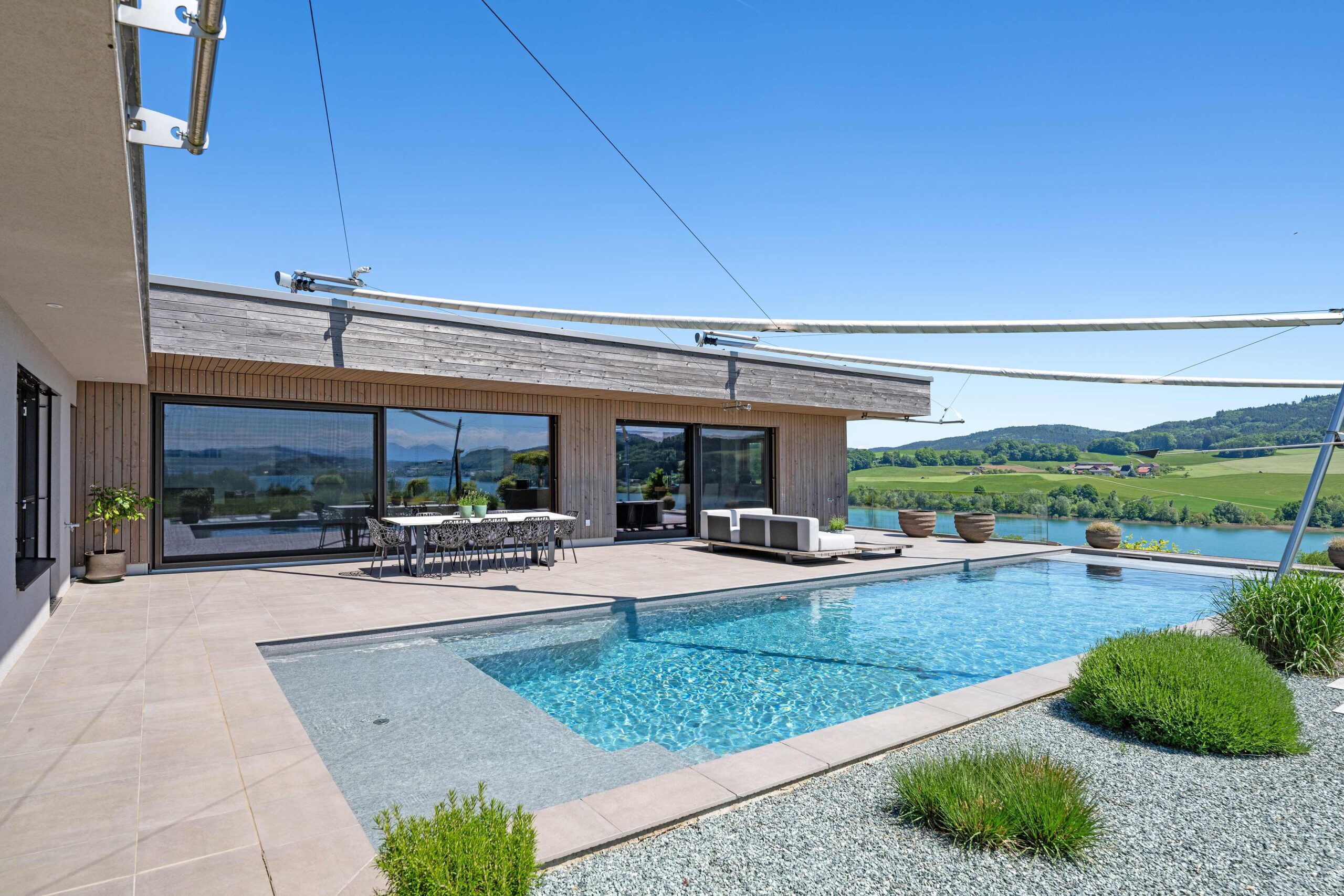Die Wohn- und Schlafräume öffnen sich zur Terrasse und zum Pool, wodurch helle, lichtdurchflutete Räume und ein direkter Bezug zum Außenbereich entstehen. Überdachte Bereiche und konstruktiver Sonnenschutz schaffen angenehme Schattenzonen und erhöhen die Aufenthaltsqualität auf den Terrassen. Großflächige Verglasungen sorgen nicht nur für viel Tageslicht, sondern rahmen den Seeblick ein und verbinden Innen- und Außenraum visuell zu einem einheitlichen Erlebnis.