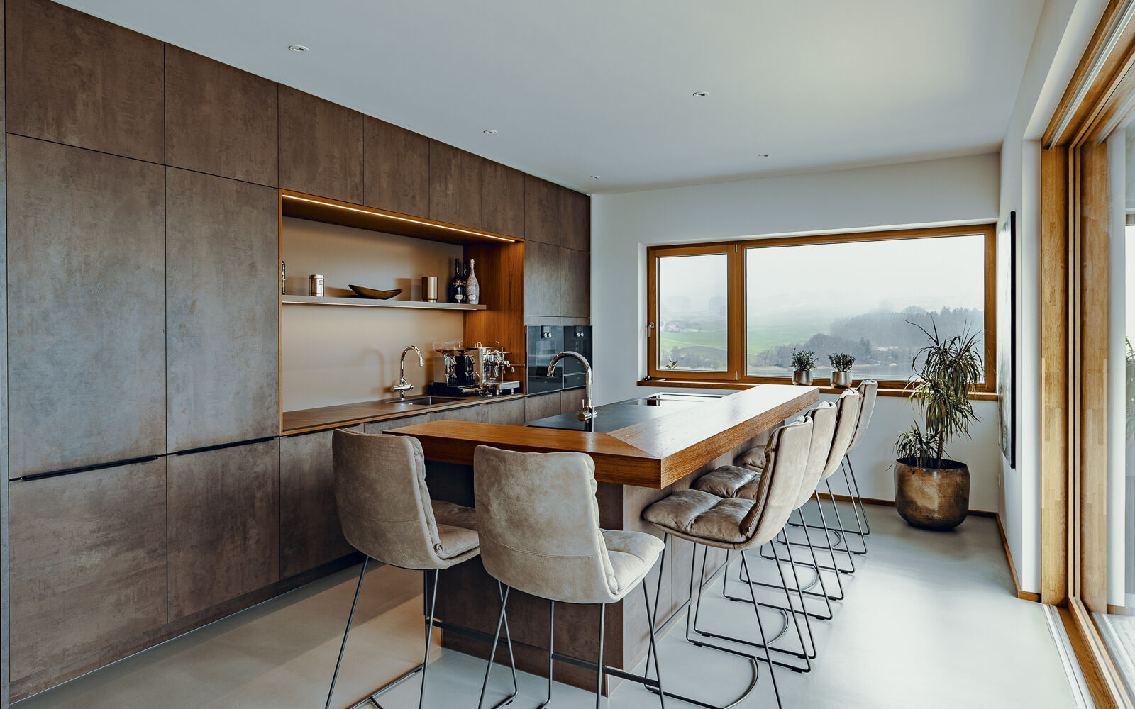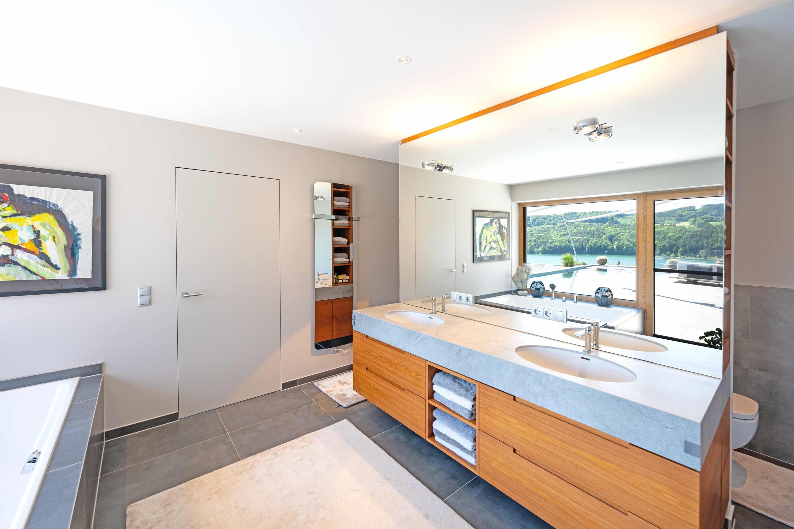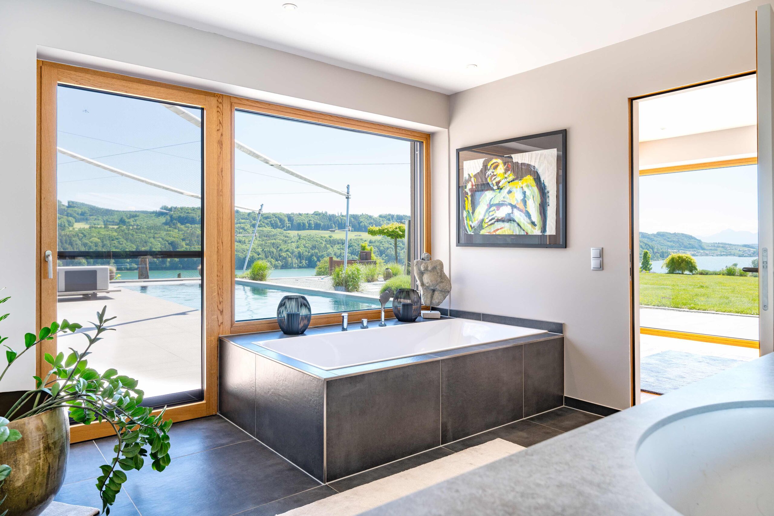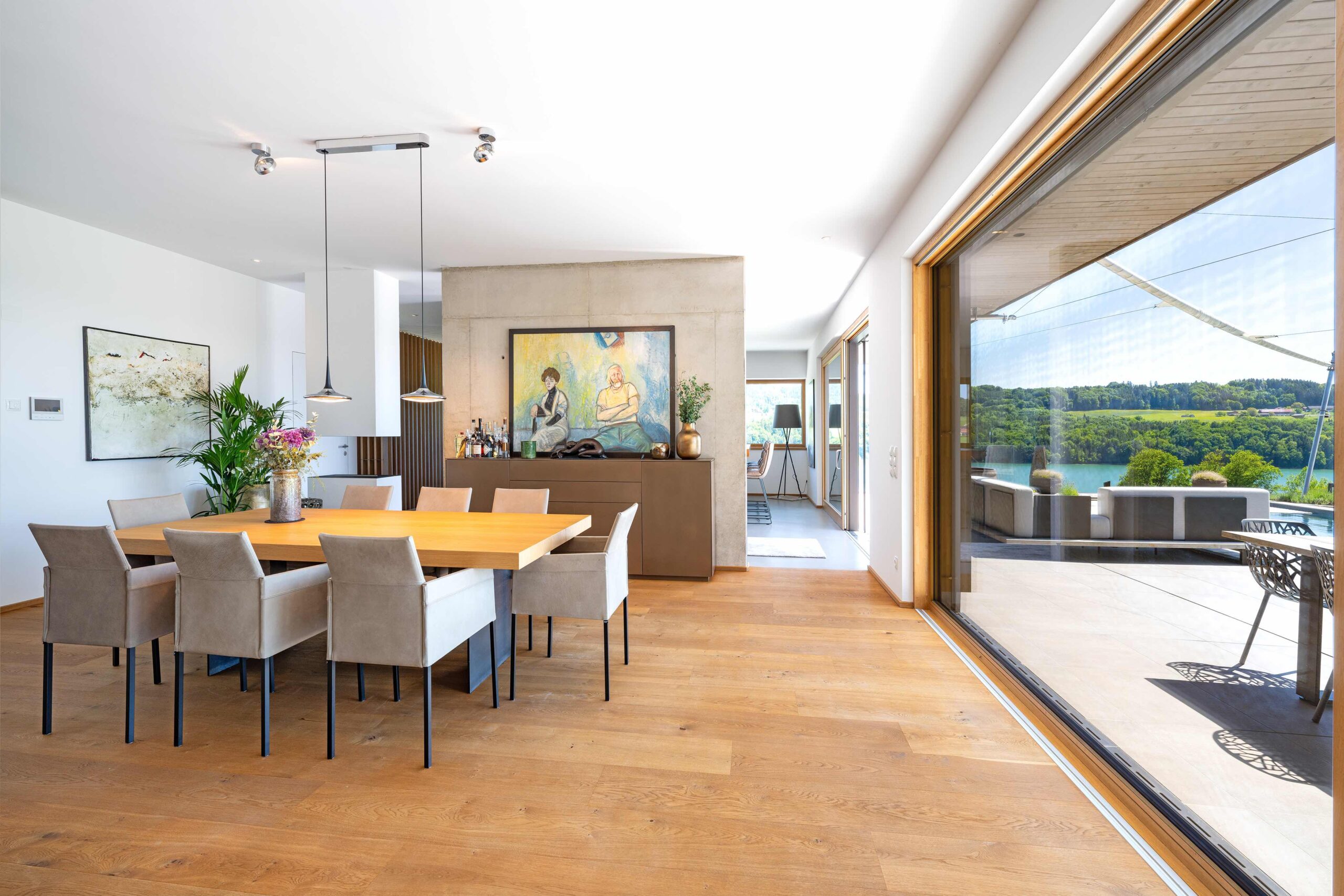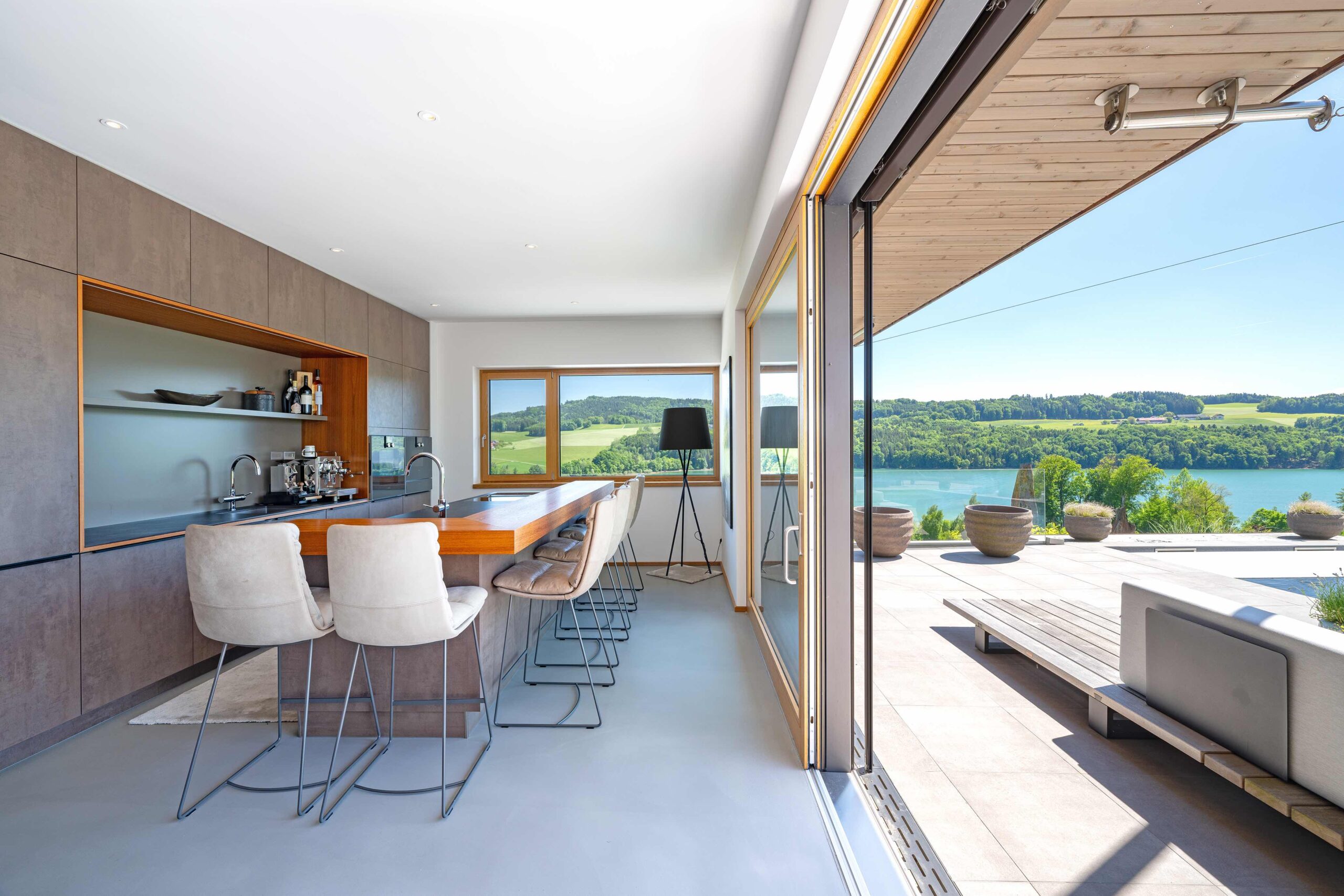 Die Wohn- und Schlafräume öffnen sich zur Terrasse und zum Pool, wodurch helle, lichtdurchflutete Räume und ein direkter Bezug zum Außenbereich entstehen. Überdachte Bereiche und konstruktiver Sonnenschutz schaffen angenehme Schattenzonen und erhöhen die Aufenthaltsqualität auf den Terrassen. Großflächige Verglasungen sorgen nicht nur für viel Tageslicht, sondern rahmen den Seeblick ein und verbinden Innen- und Außenraum visuell zu einem einheitlichen Erlebnis.