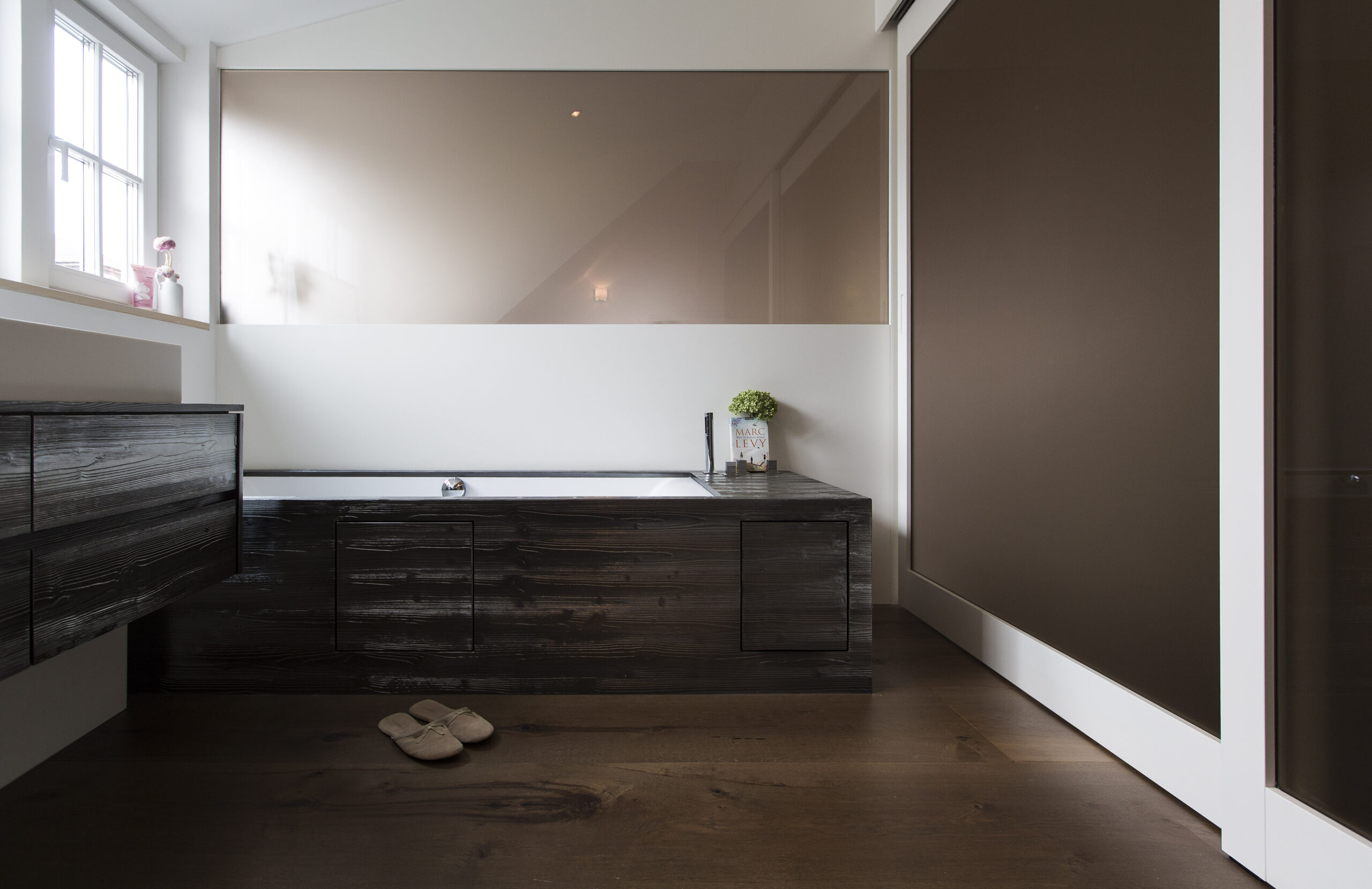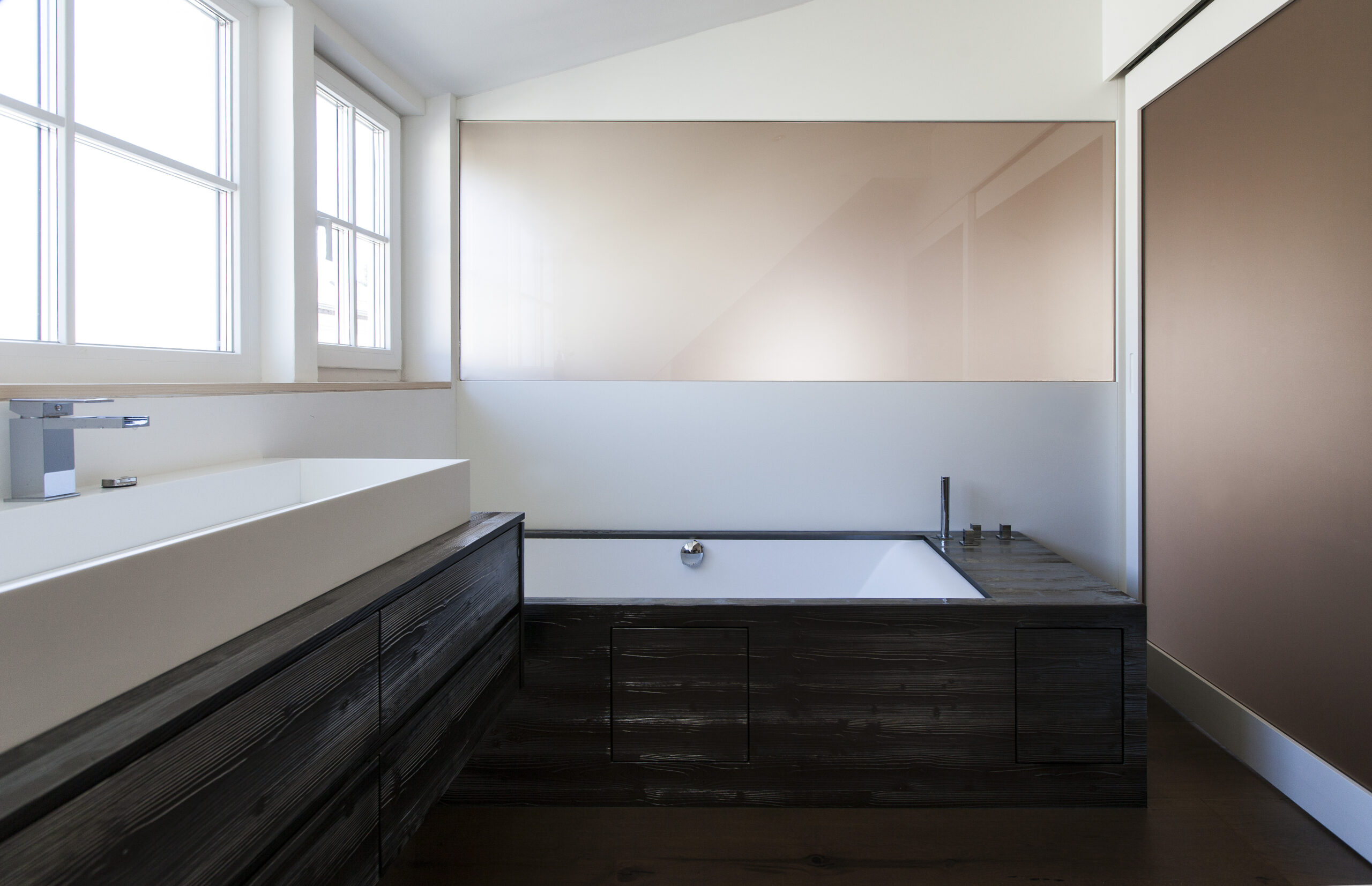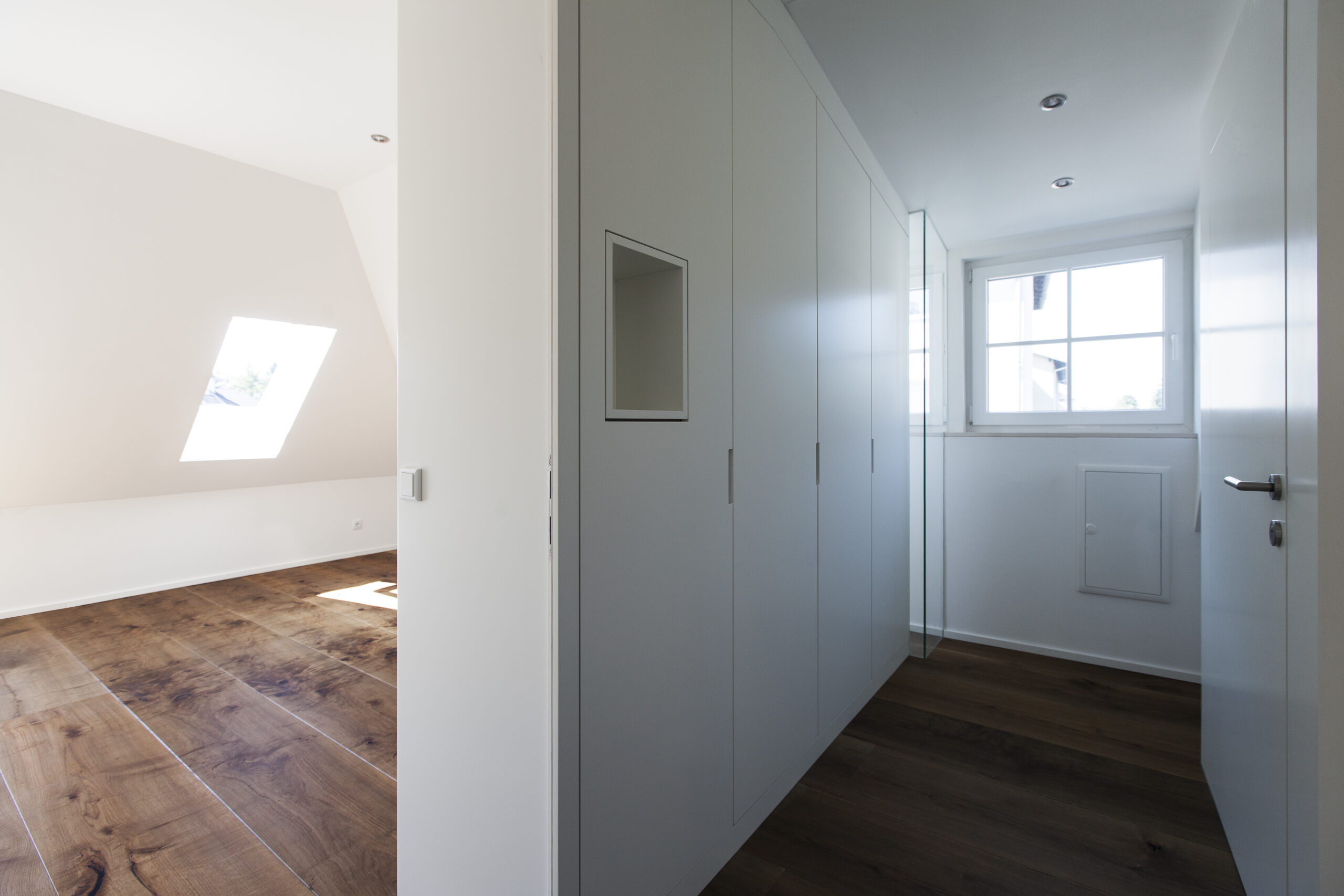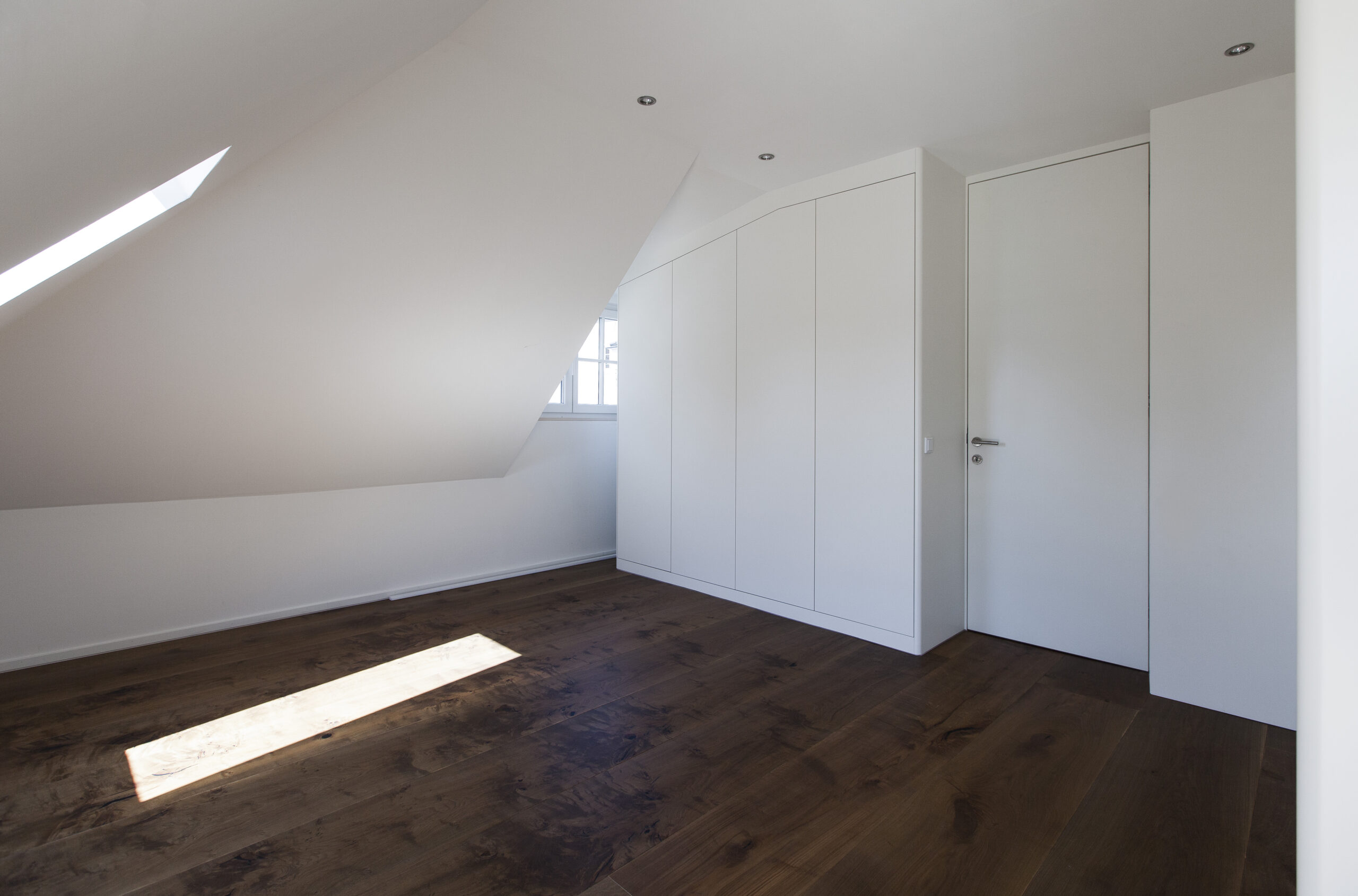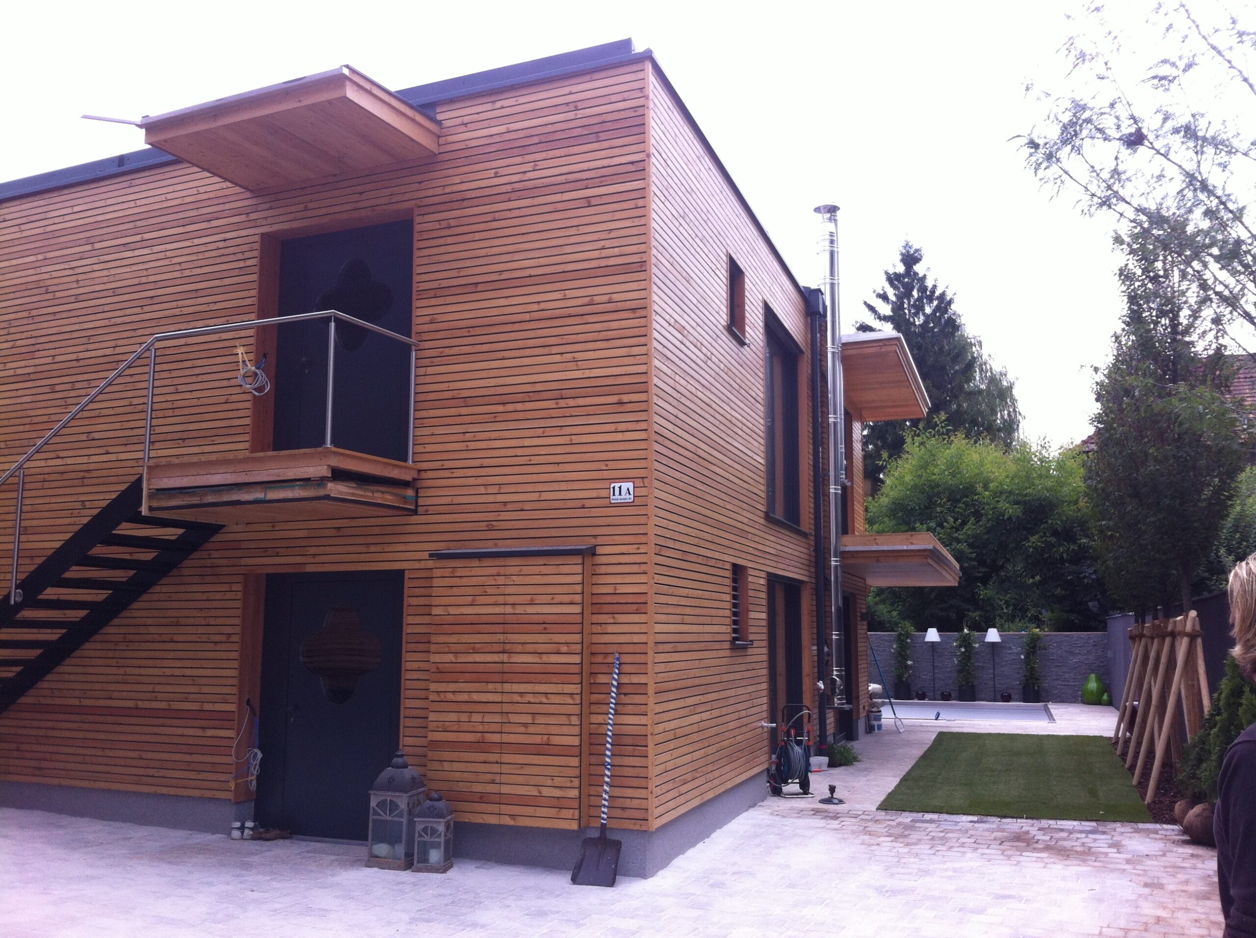 Im Rahmen der städtischen Nachverdichtung wurde das bestehende Grundstück durch ein zweigeschossiges Haus mit Flachdach in Holzriegelbauweise ergänzt. Das neue Gebäude besteht aus zwei getrennten Wohnungen, die jeweils eigenständige Wohnbereiche bieten. Die Fassade ist mit einer Holzschalung ausgeführt.