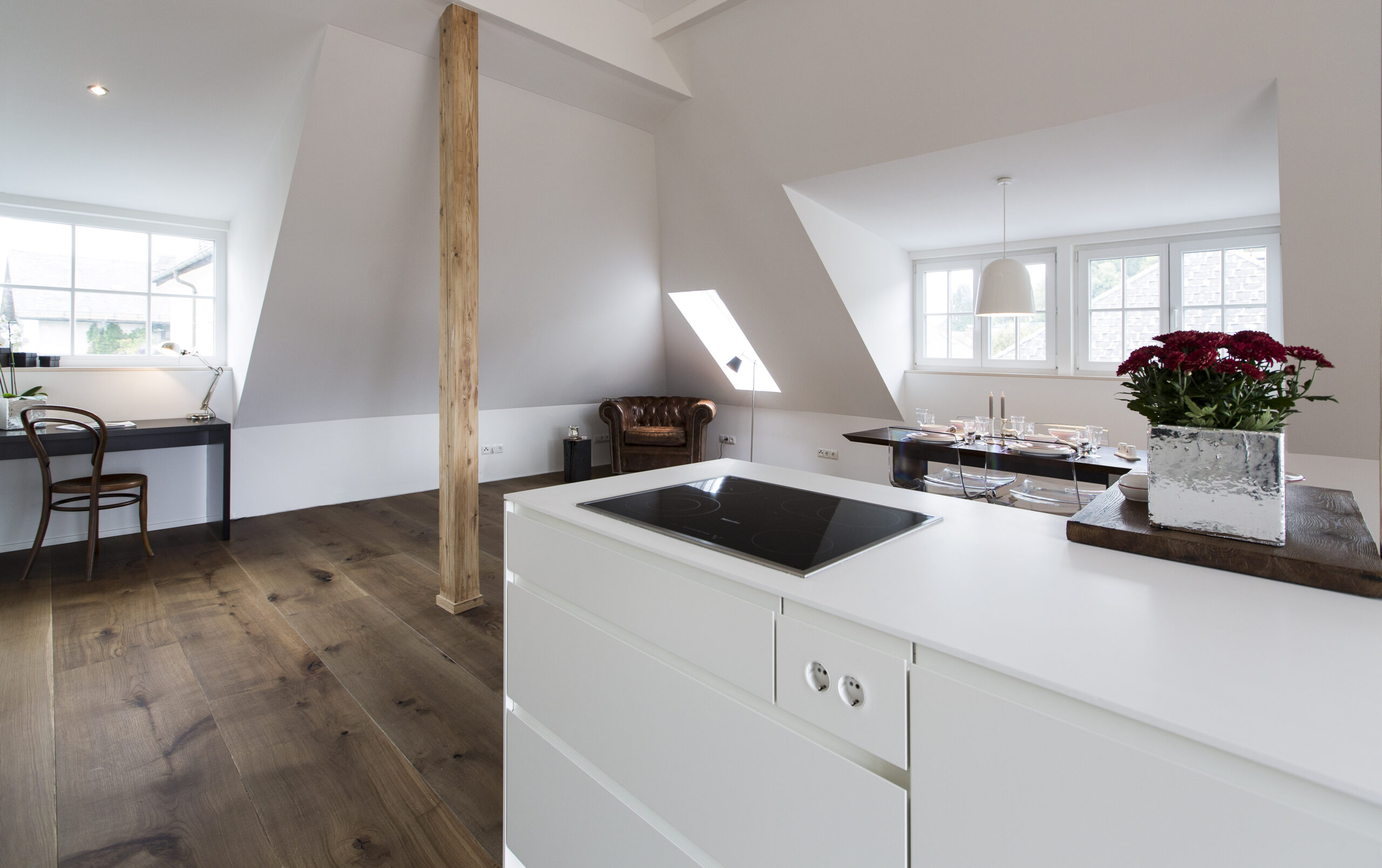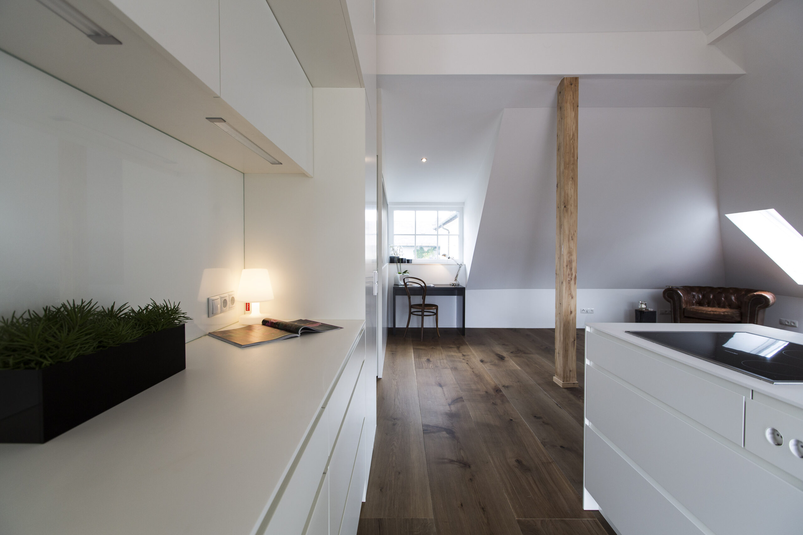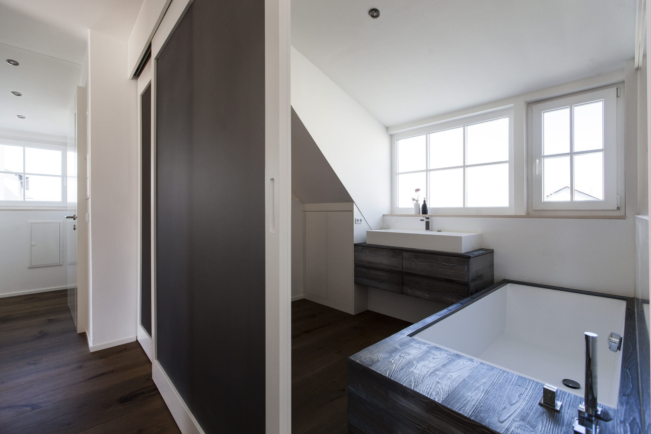 Das bestehende Wohnhaus an der Straße wurde generalsaniert und um einen Dachbodenausbau erweitert. Im Erdgeschoss wurde straßenseitig eine Büroeinheit geschaffen, während hofseitig die alte Werkstatt zu einer Wohnung umgebaut wurde. Im Obergeschoss wurde die Wohnung saniert, und im Dachgeschoss wurde durch den Ausbau eine neue Wohnung mit Balkon geschaffen, sodass der vorhandene Wohnraum effizient erweitert wurde.