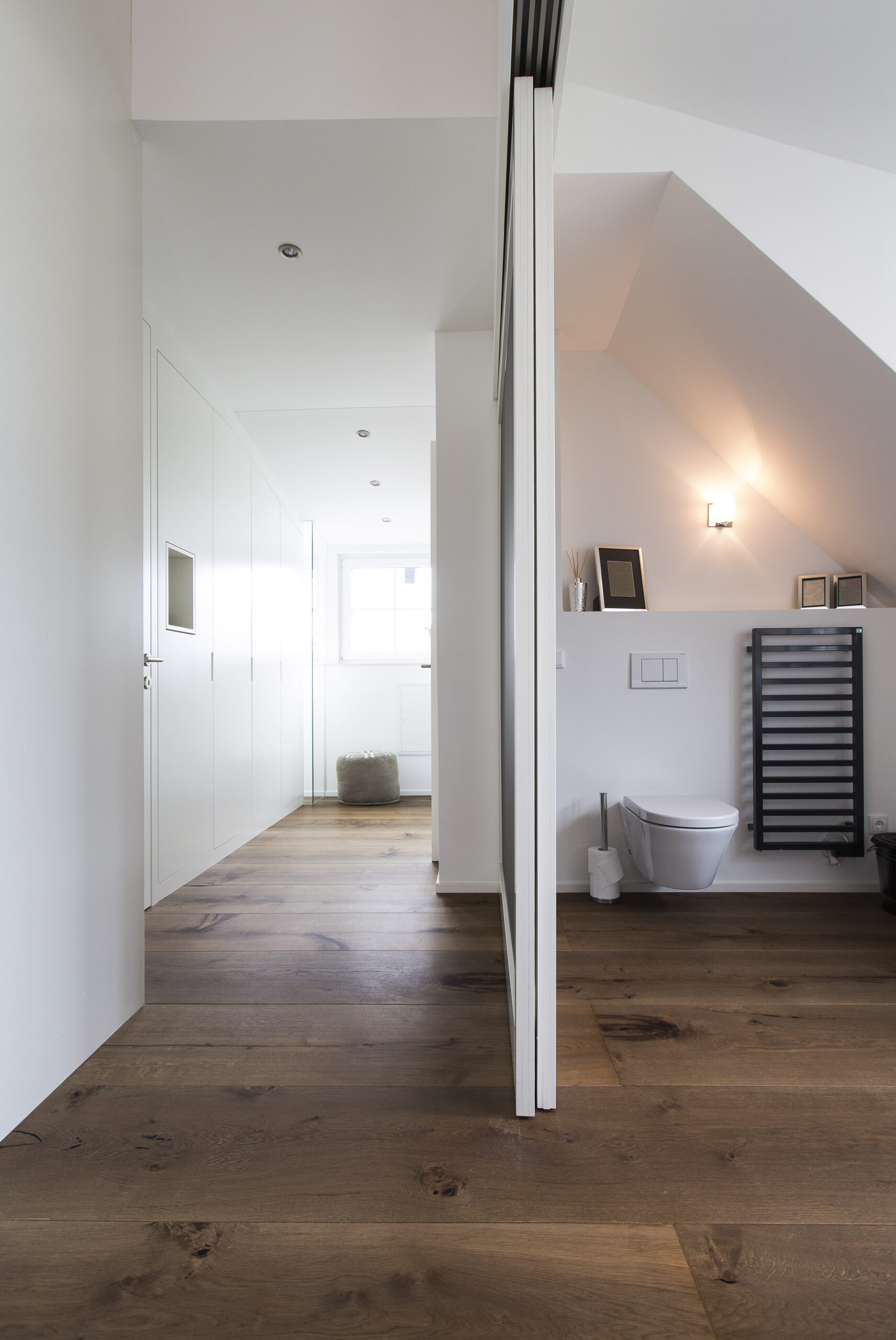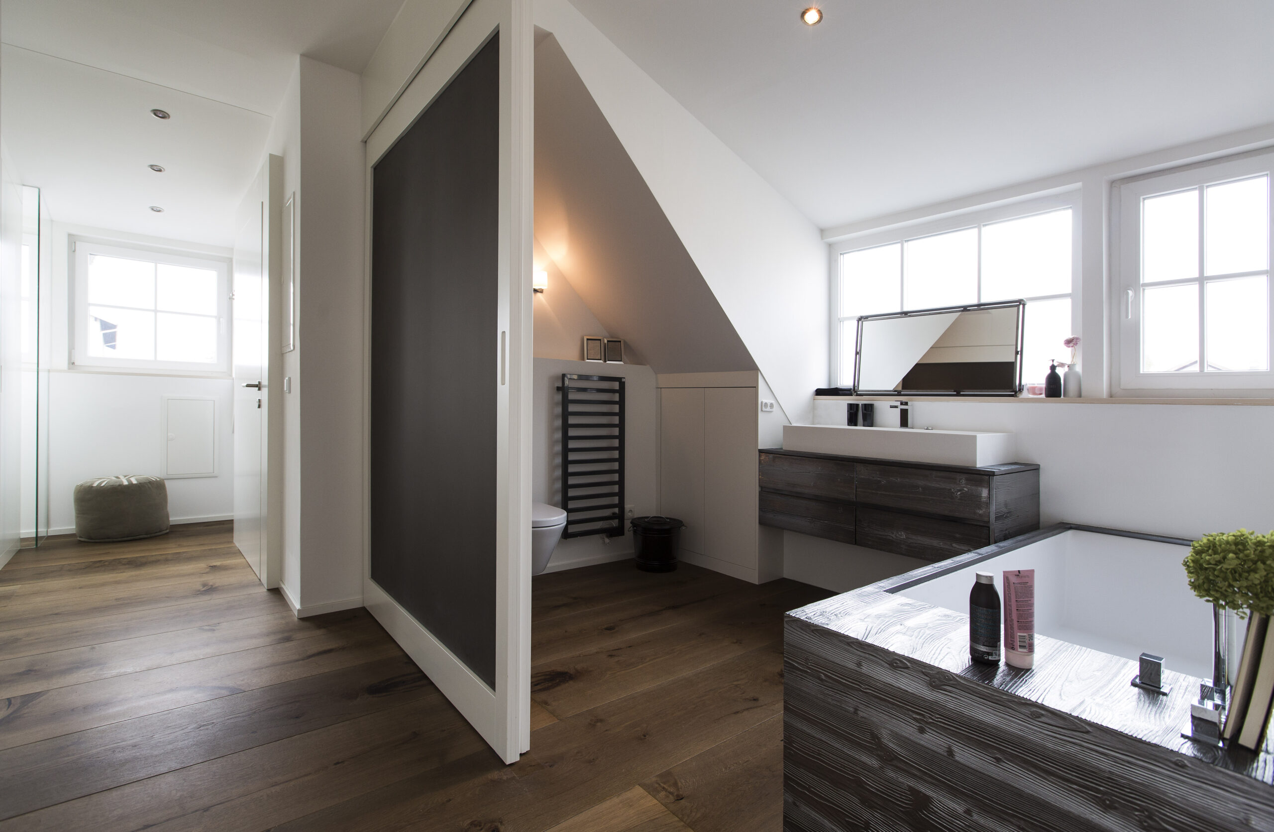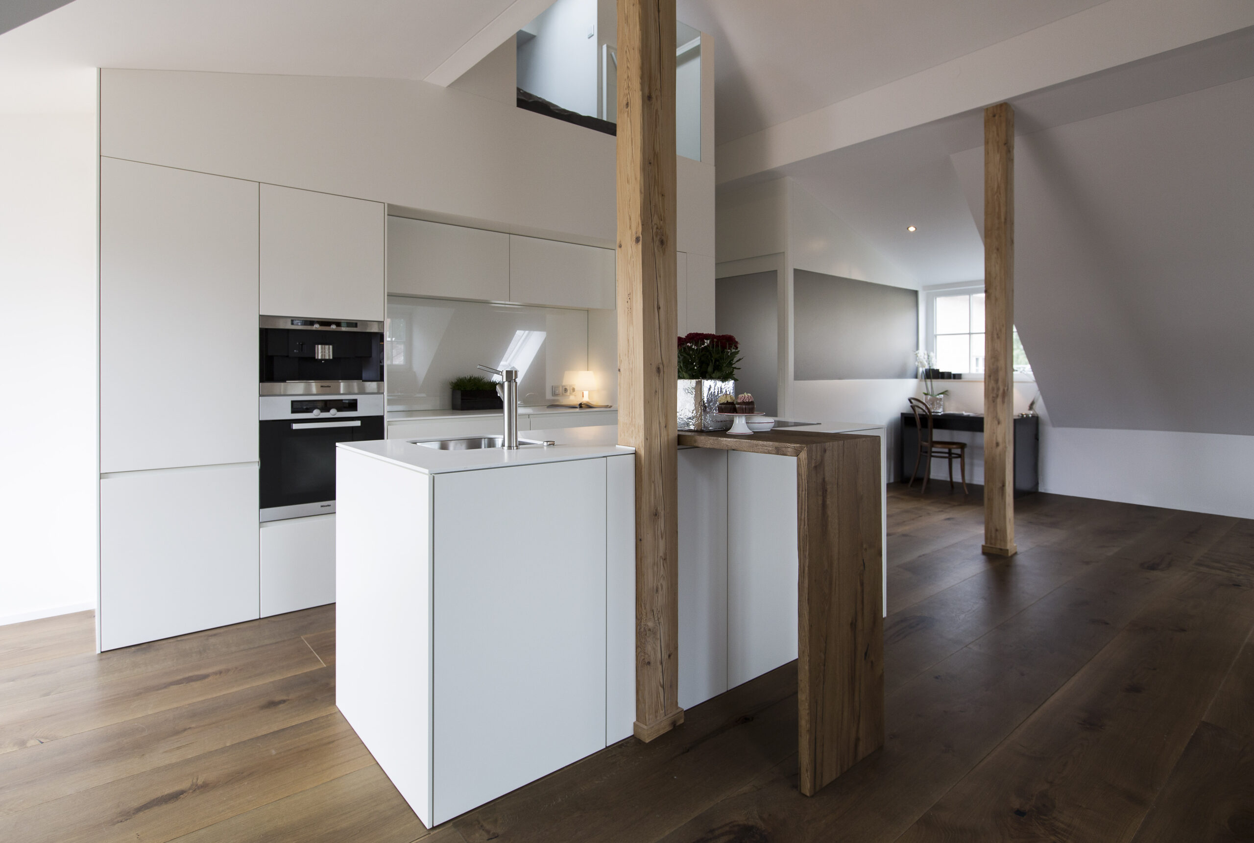 Das bestehende Wohnhaus an der Straße wurde generalsaniert und um einen Dachbodenausbau erweitert. Im Erdgeschoss wurde straßenseitig eine Büroeinheit geschaffen, während hofseitig die alte Werkstatt zu einer Wohnung umgebaut wurde. Im Obergeschoss wurde die Wohnung saniert, und im Dachgeschoss wurde durch den Ausbau eine neue Wohnung mit Balkon geschaffen, sodass der vorhandene Wohnraum effizient erweitert wurde.