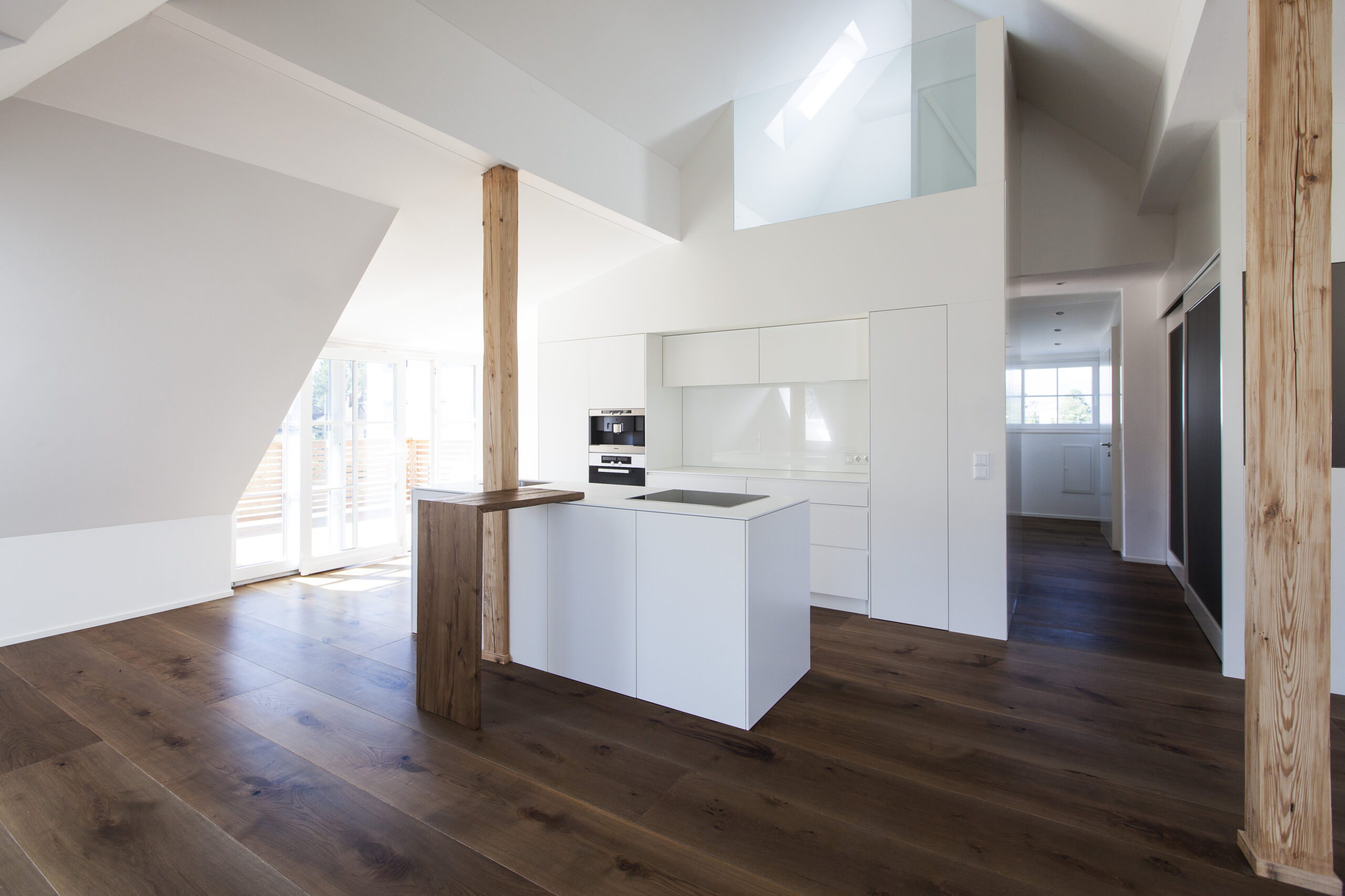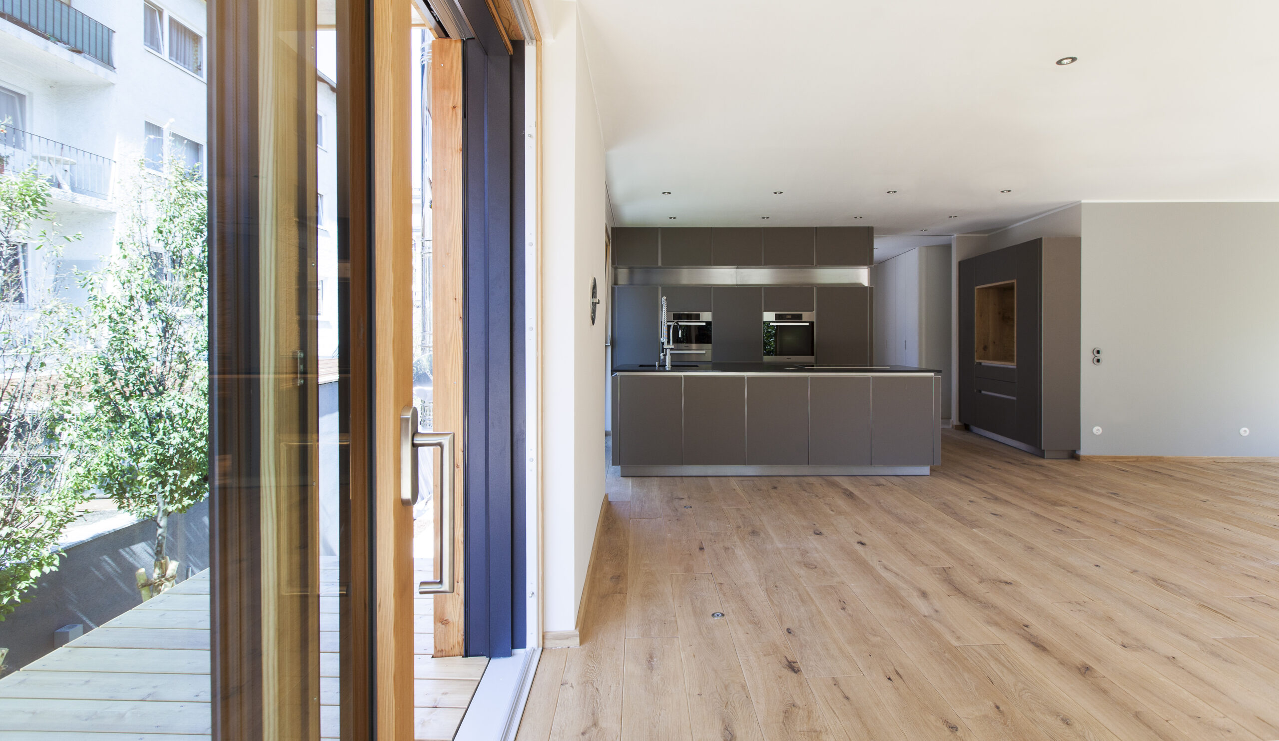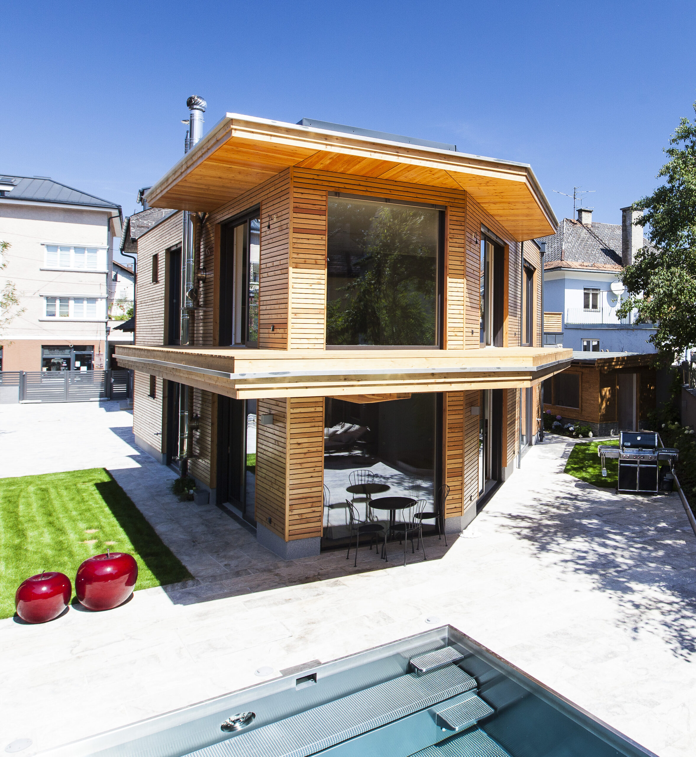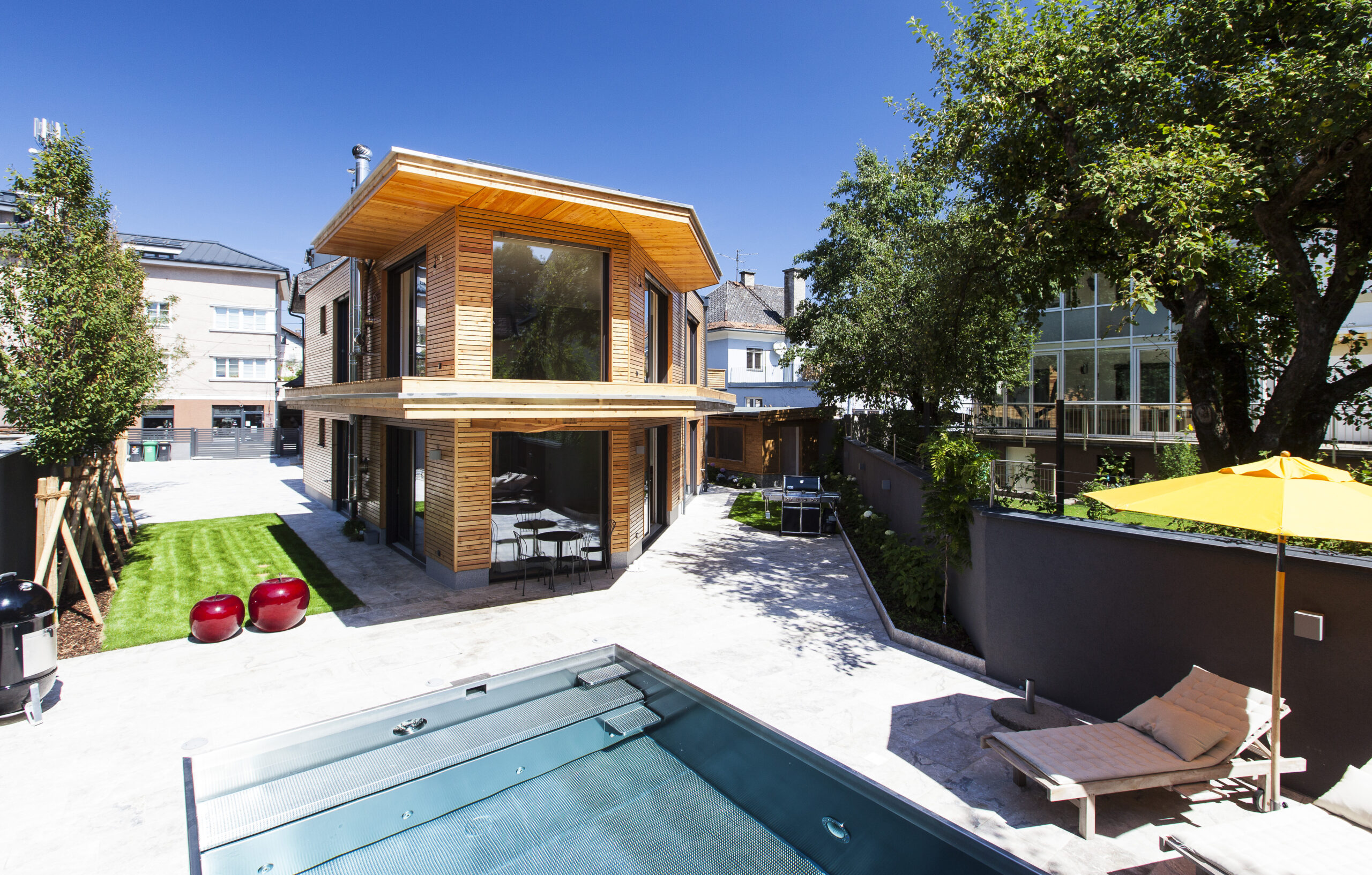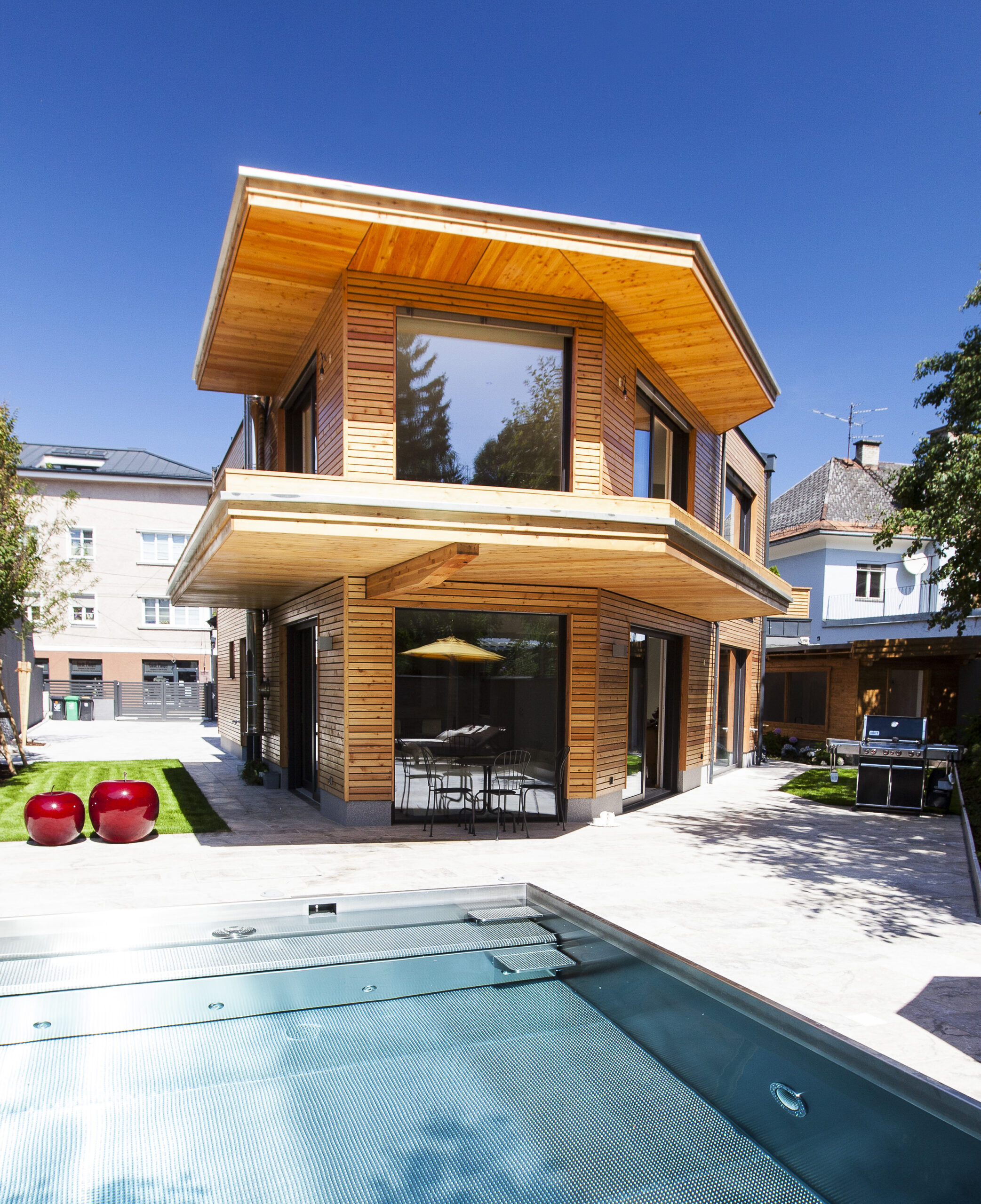 Die Wohnungen im neuen Gebäude verfügen über großzügige Grundrisse mit offener Küche und Essbereich. Großflächige Verglasungen sorgen für Tageslicht und Transparenz, während Vordächer als konstruktiver Sonnenschutz Überhitzung im Sommer reduzieren. Der Eingangsbereich ist hell gestaltet und bietet ausreichend Stauraum. Balkone, Terrassen und ein Pool im Erdgeschoss erweitern den Wohnraum ins Freie.