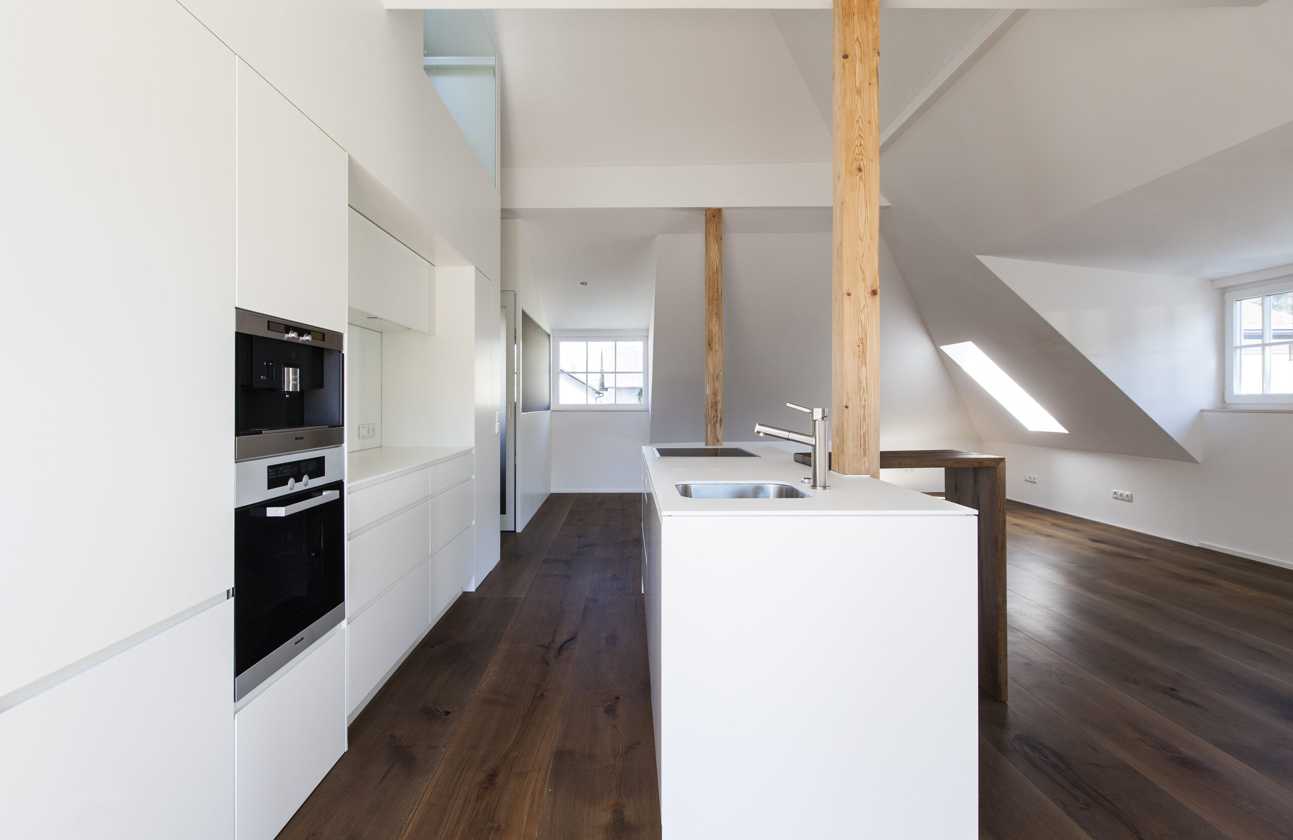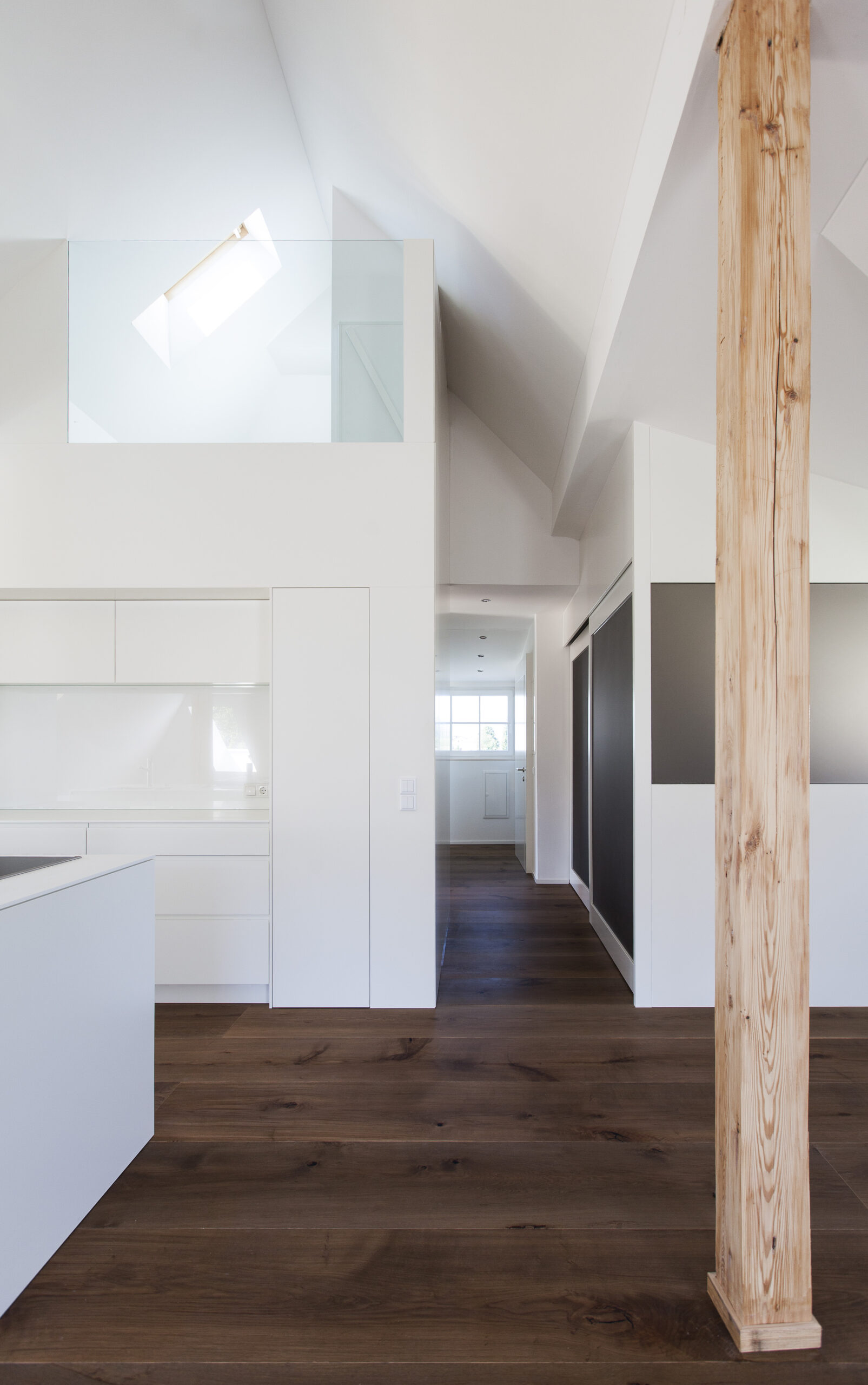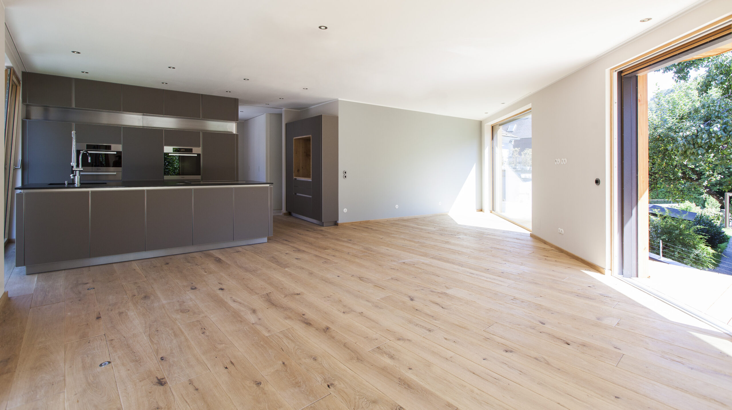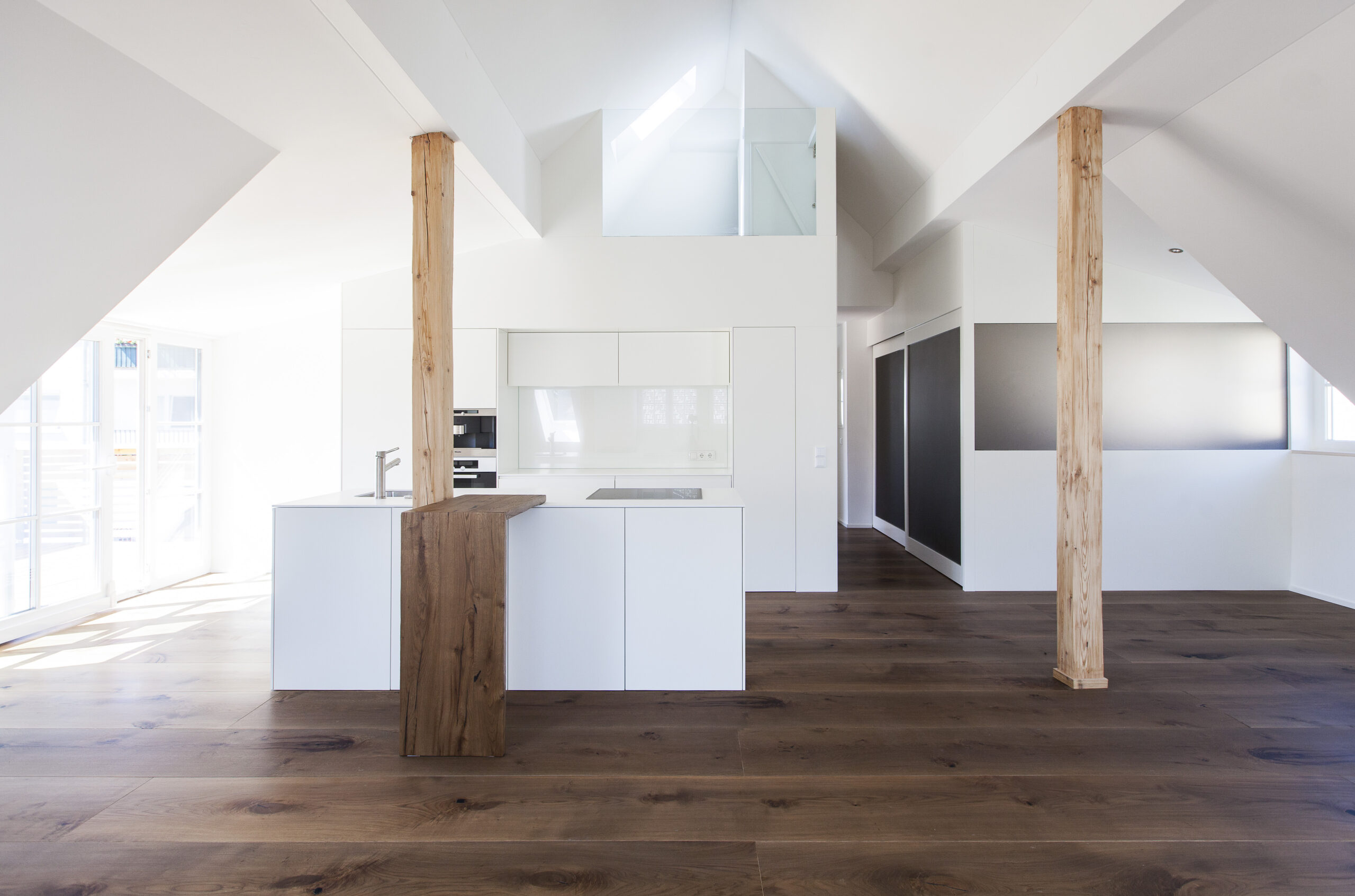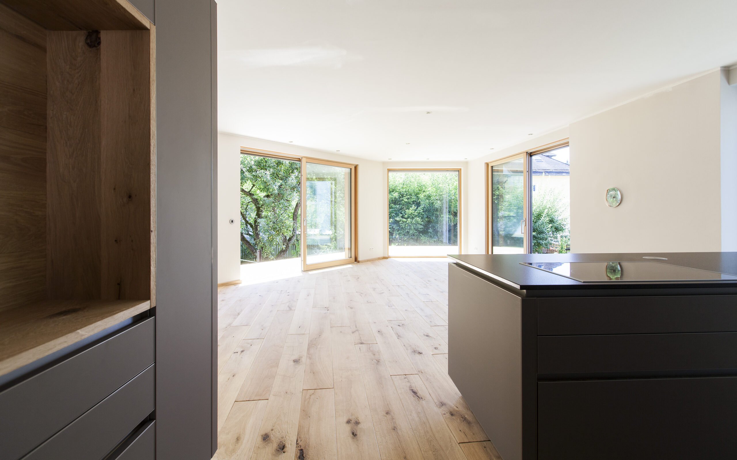 Die Wohnungen im neuen Gebäude verfügen über großzügige Grundrisse mit offener Küche und Essbereich. Großflächige Verglasungen sorgen für Tageslicht und Transparenz, während Vordächer als konstruktiver Sonnenschutz Überhitzung im Sommer reduzieren. Der Eingangsbereich ist hell gestaltet und bietet ausreichend Stauraum. Balkone, Terrassen und ein Pool im Erdgeschoss erweitern den Wohnraum ins Freie.
