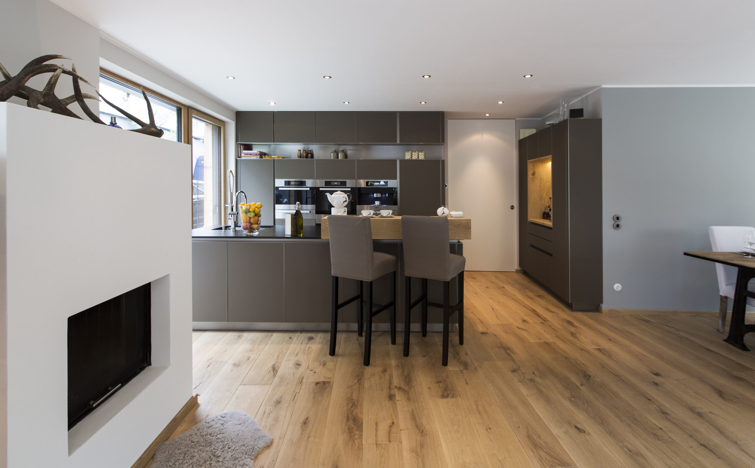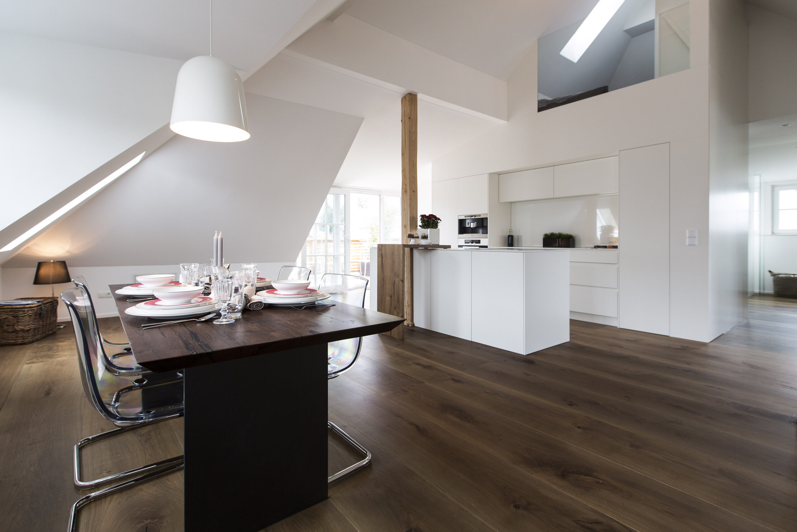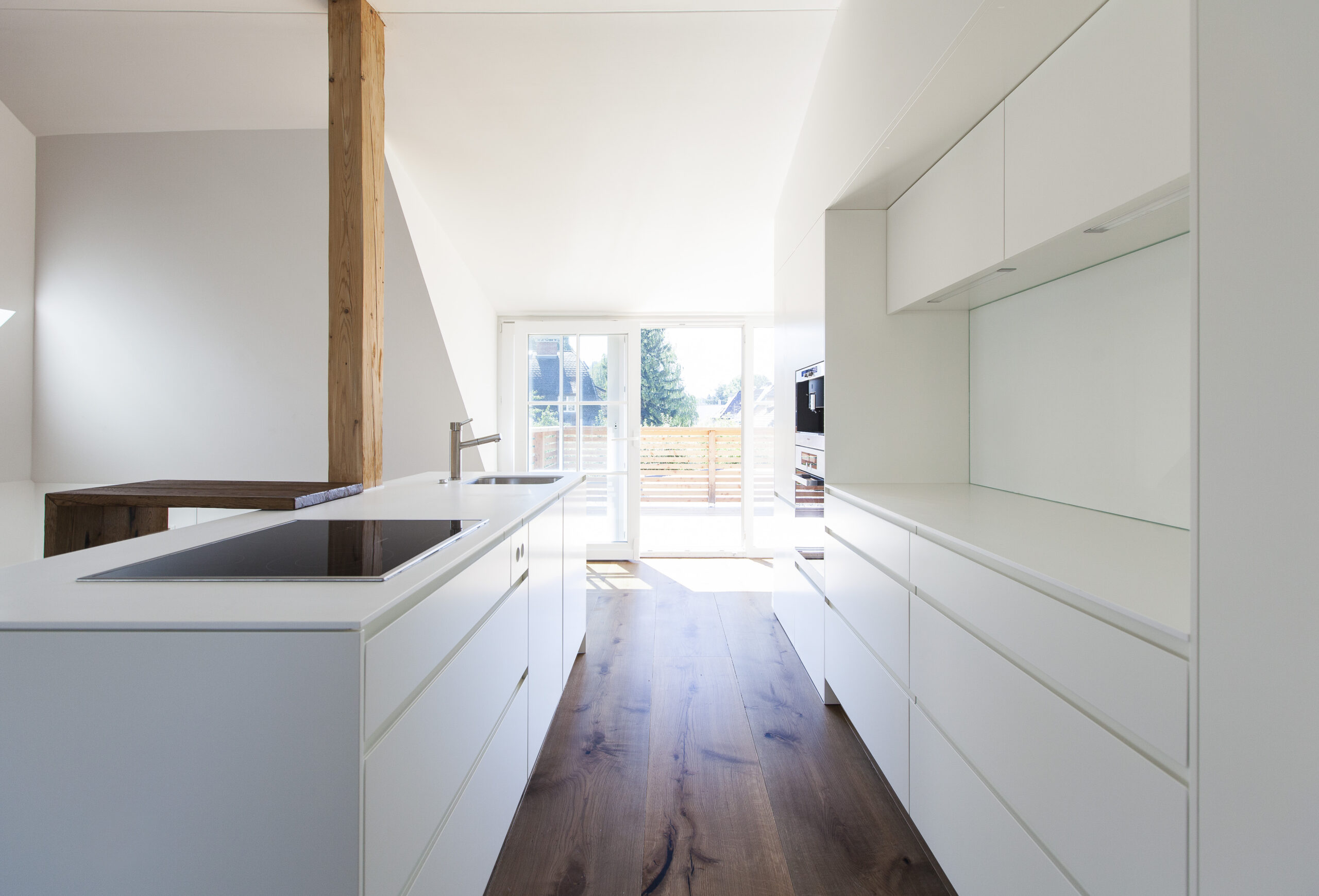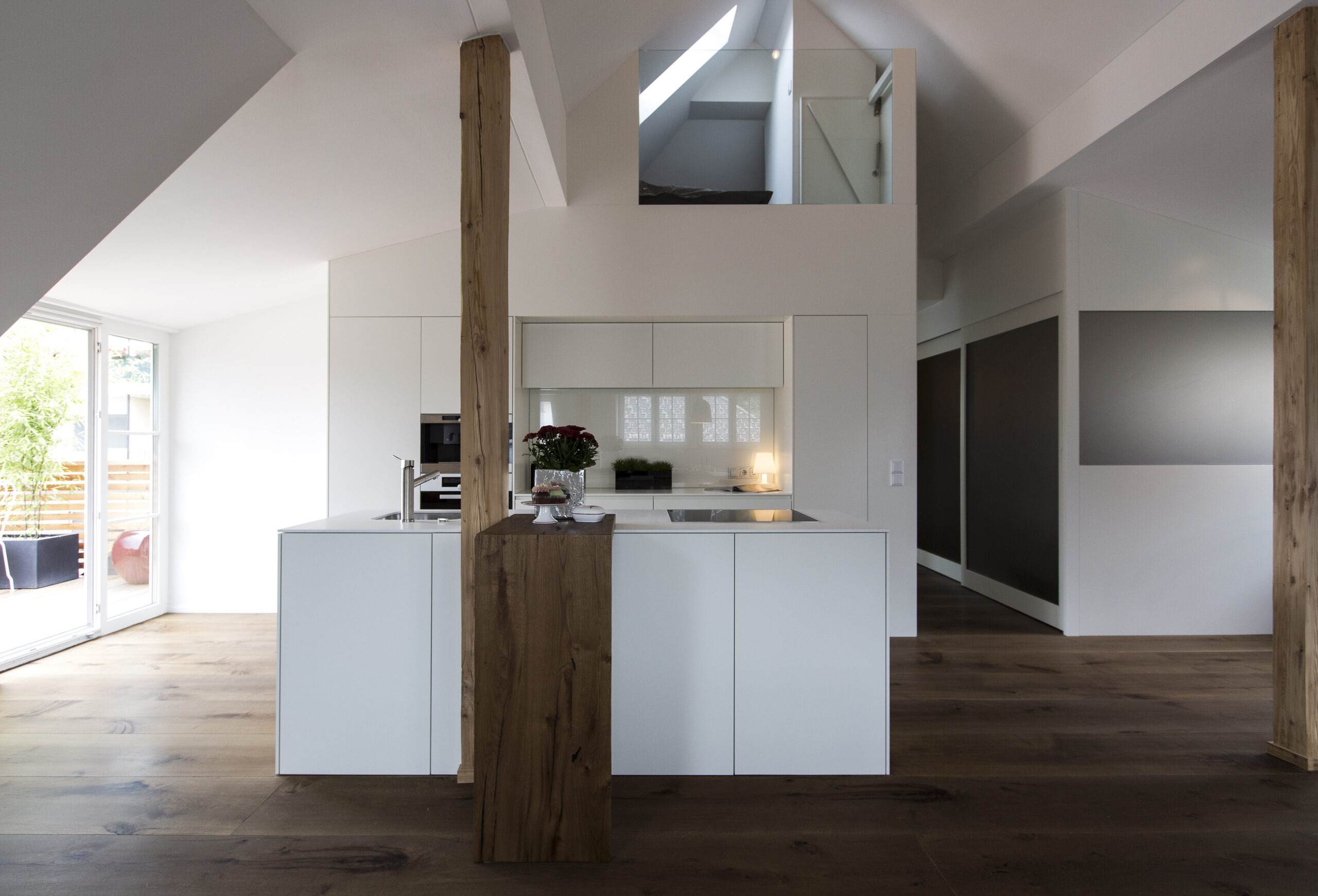 Die Wohnungen im neuen Gebäude verfügen über großzügige Grundrisse mit offener Küche und Essbereich. Großflächige Verglasungen sorgen für Tageslicht und Transparenz, während Vordächer als konstruktiver Sonnenschutz Überhitzung im Sommer reduzieren. Der Eingangsbereich ist hell gestaltet und bietet ausreichend Stauraum. Balkone, Terrassen und ein Pool im Erdgeschoss erweitern den Wohnraum ins Freie.