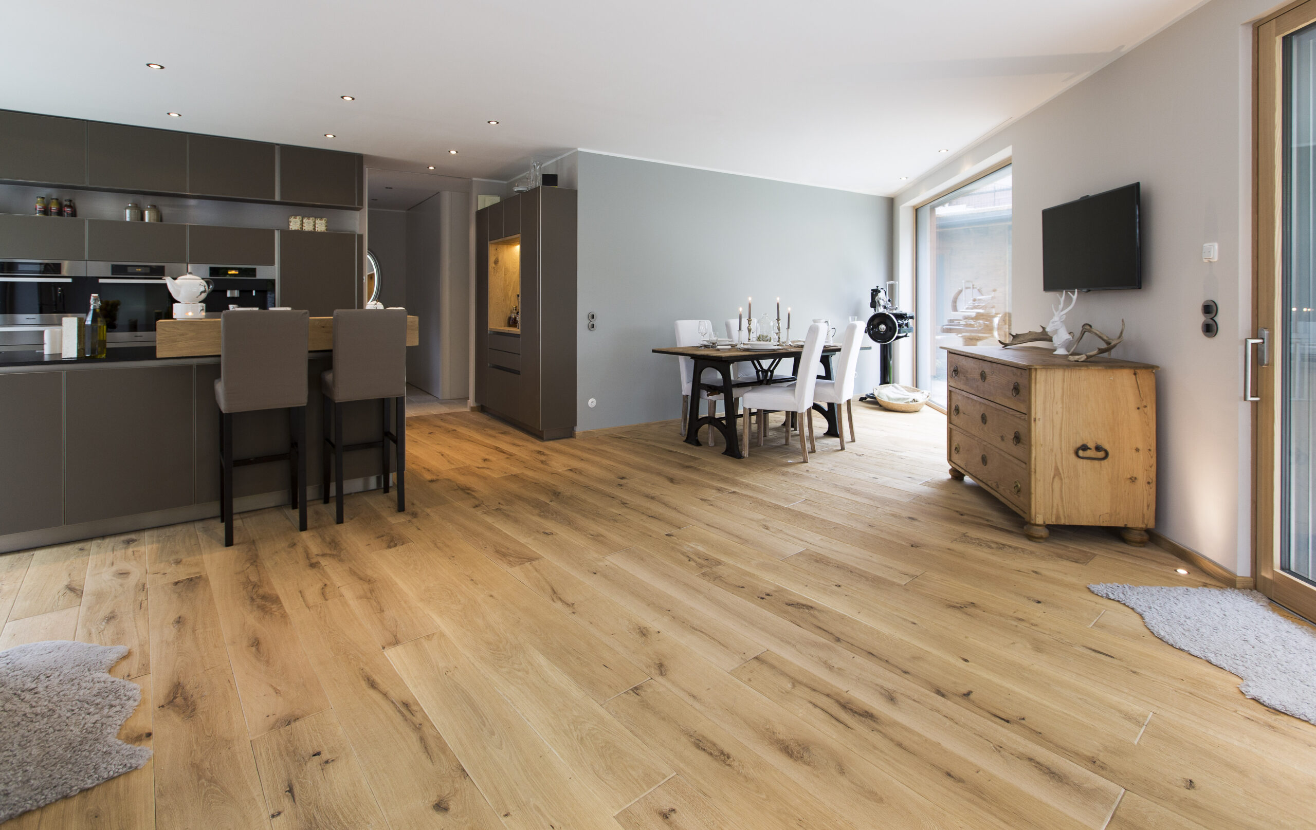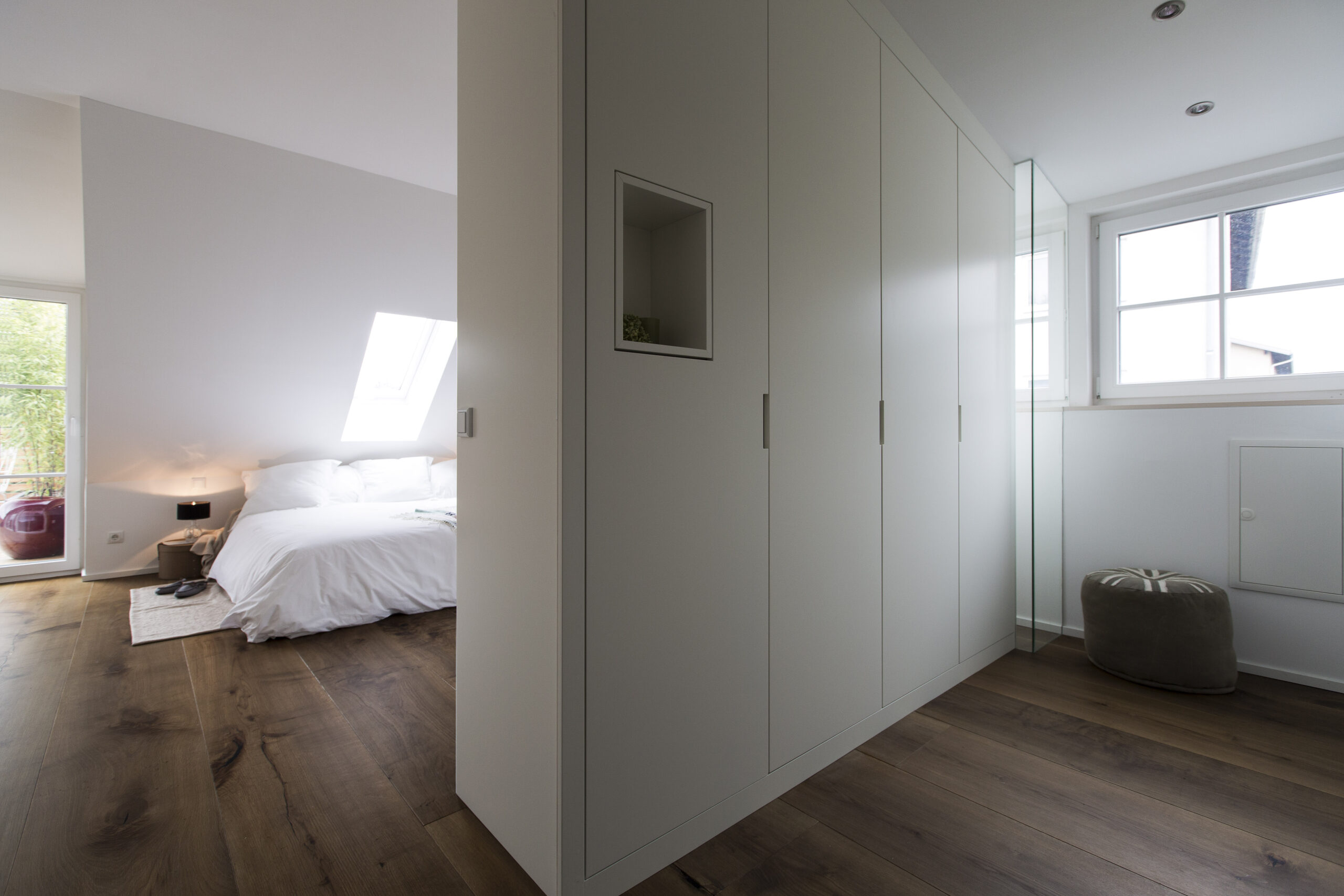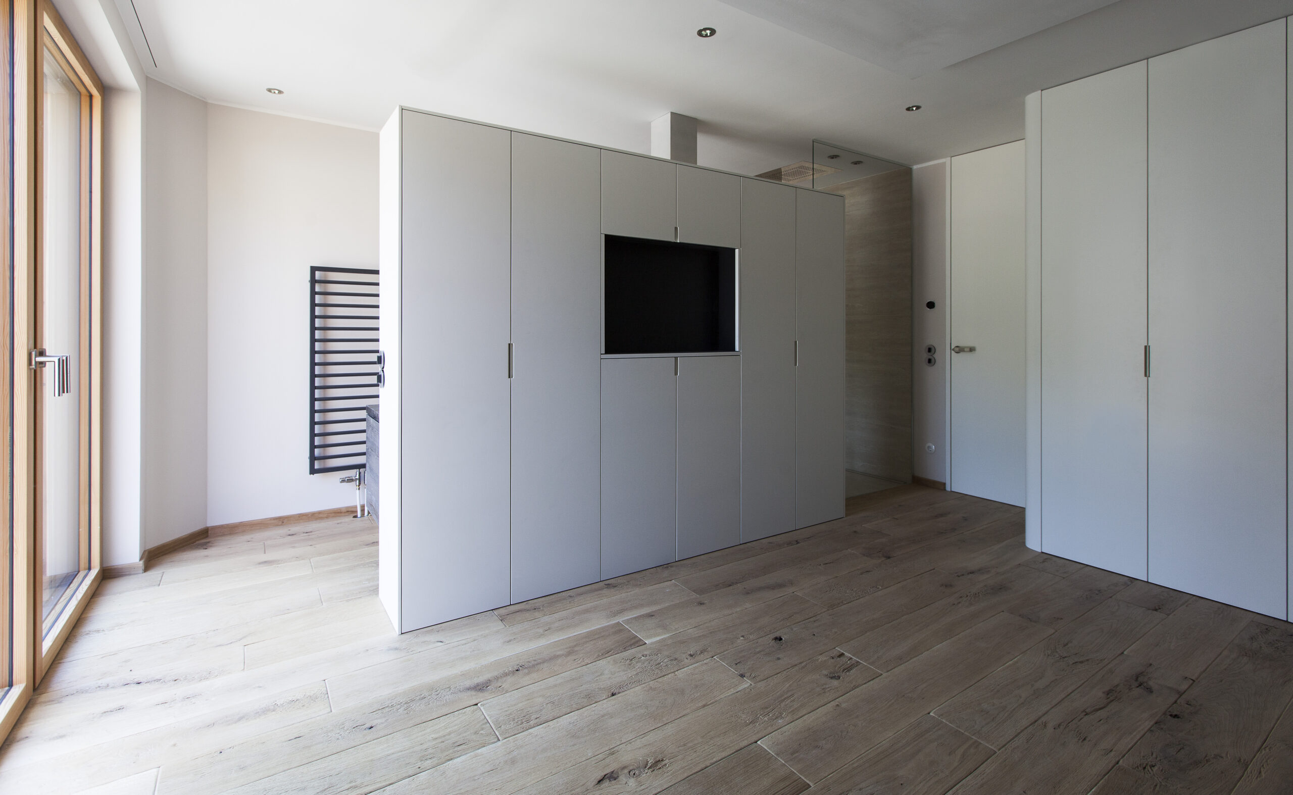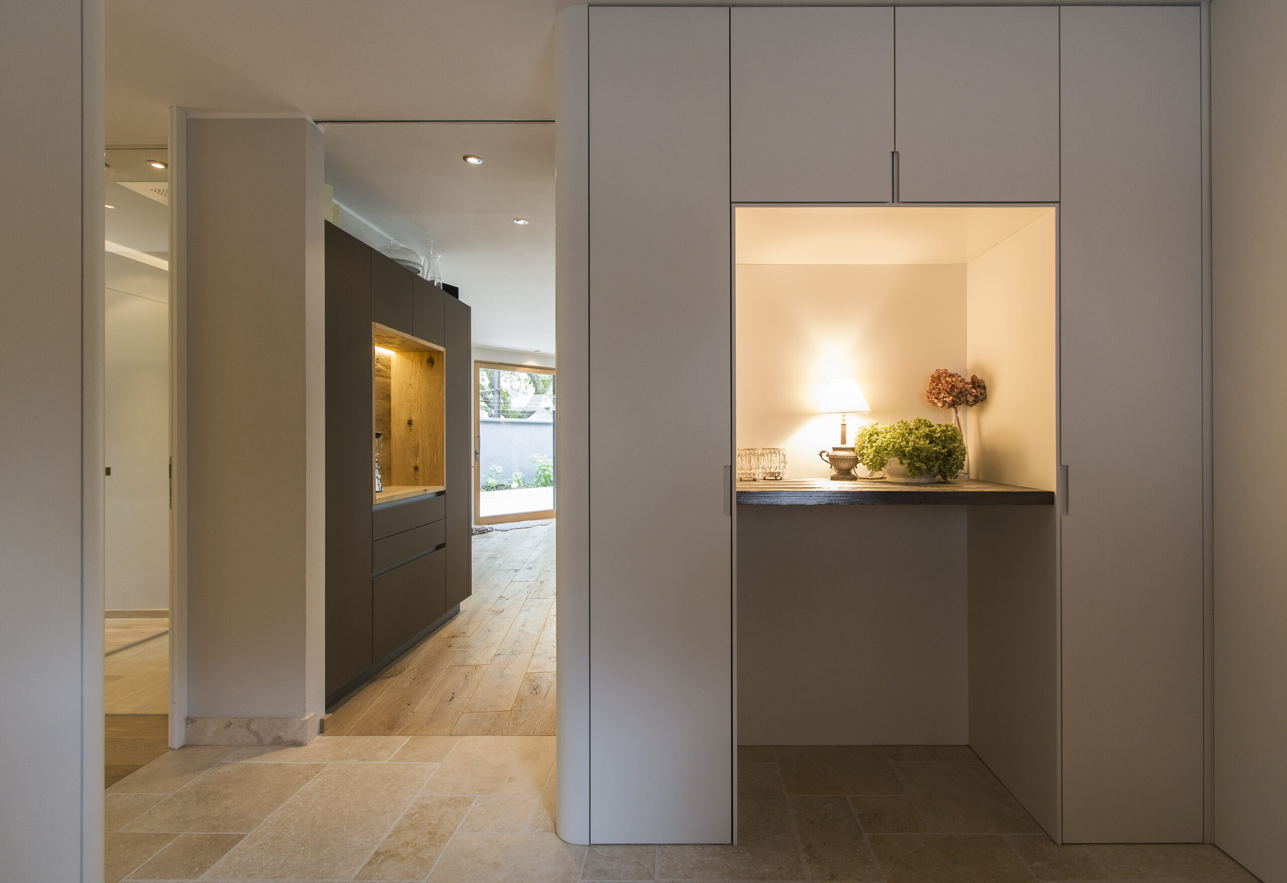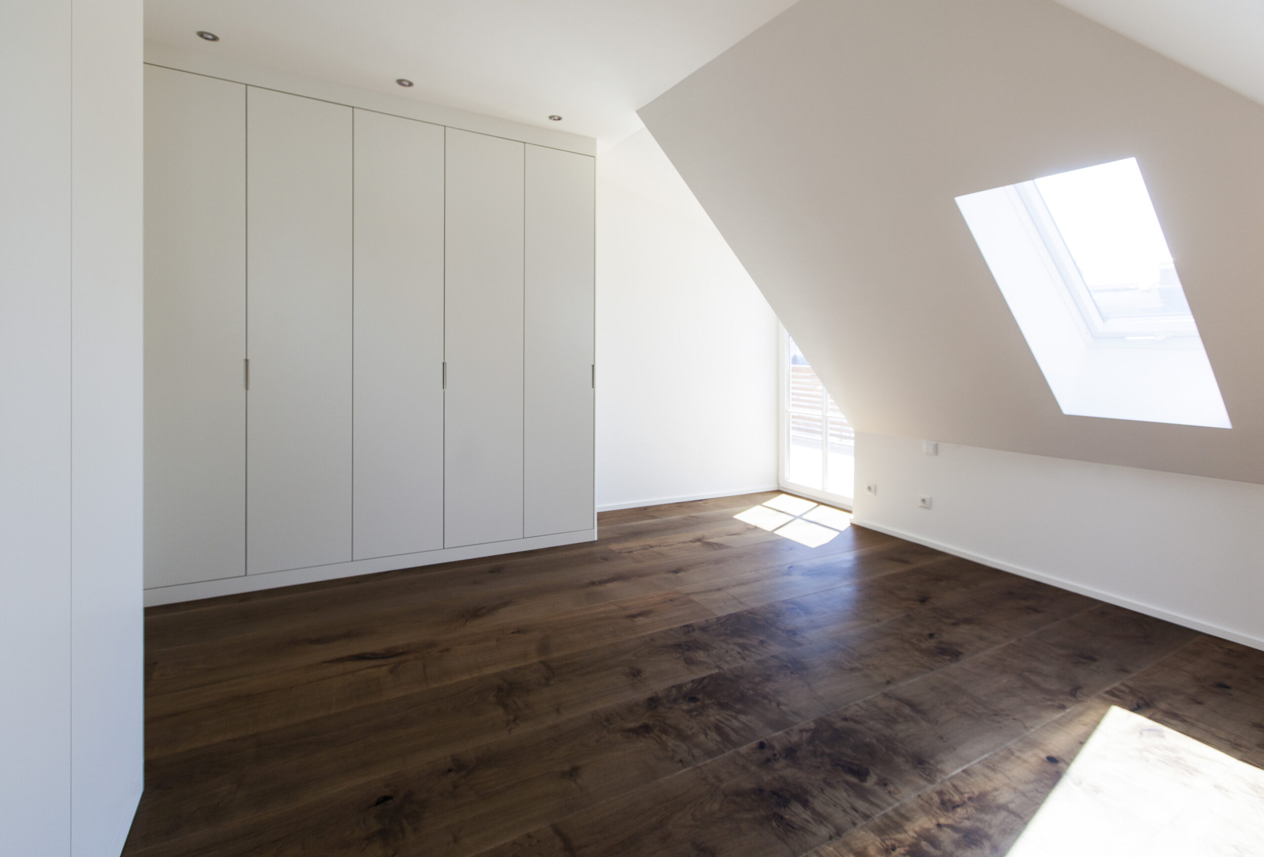 Die Wohnungen im neuen Gebäude verfügen über großzügige Grundrisse mit offener Küche und Essbereich. Großflächige Verglasungen sorgen für Tageslicht und Transparenz, während Vordächer als konstruktiver Sonnenschutz Überhitzung im Sommer reduzieren. Der Eingangsbereich ist hell gestaltet und bietet ausreichend Stauraum. Balkone, Terrassen und ein Pool im Erdgeschoss erweitern den Wohnraum ins Freie.