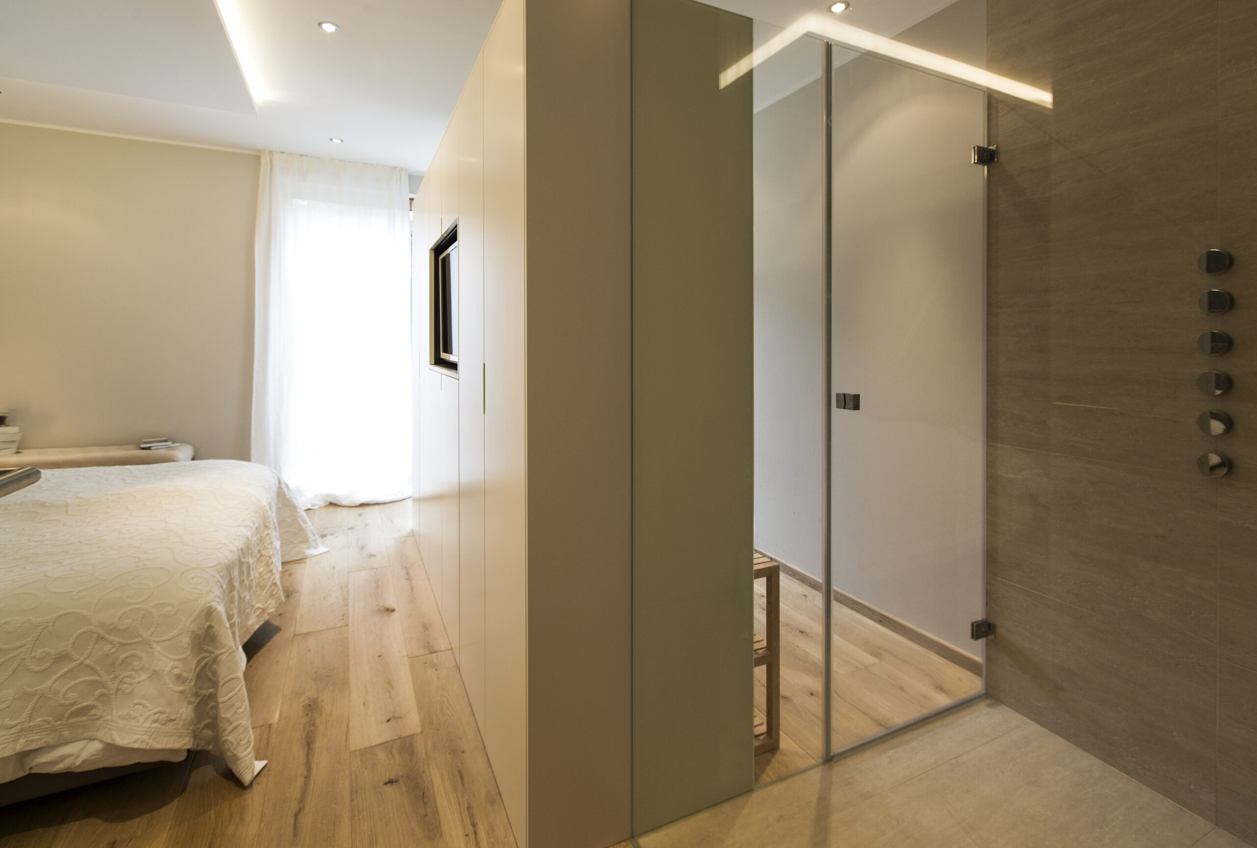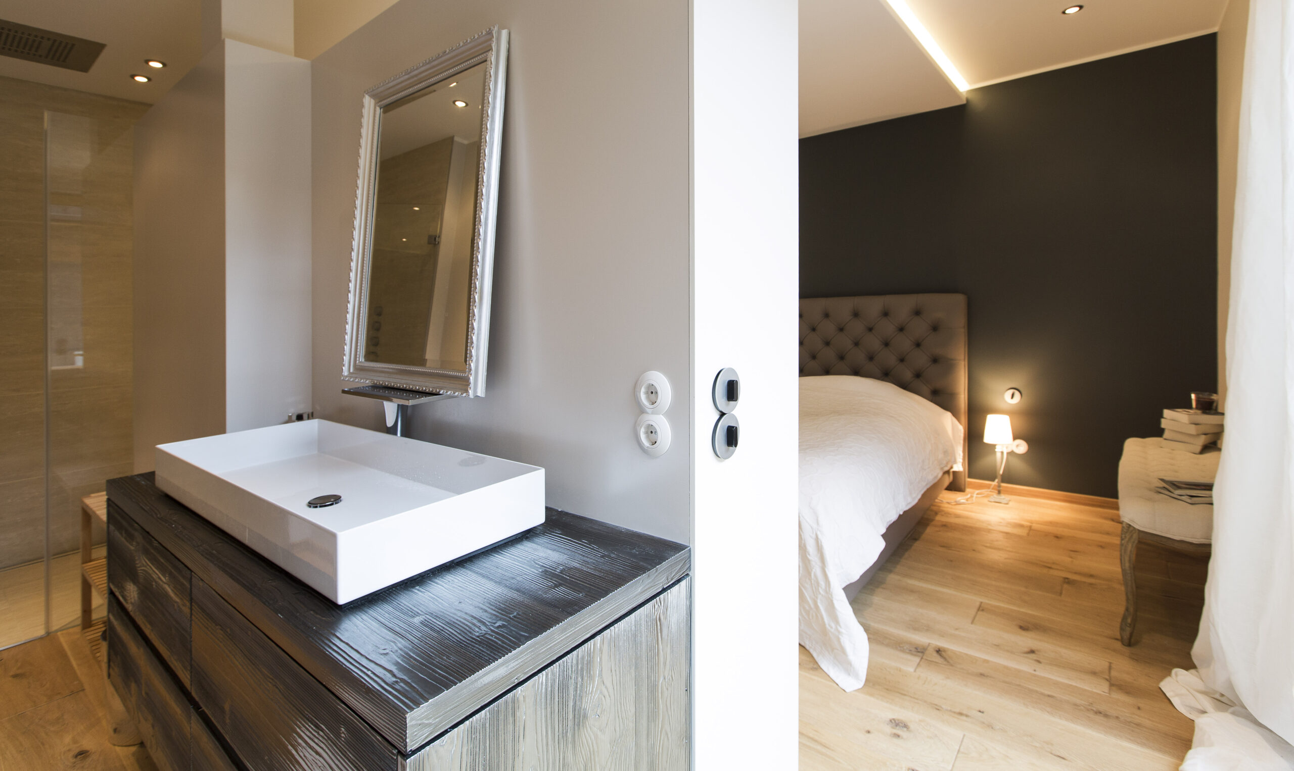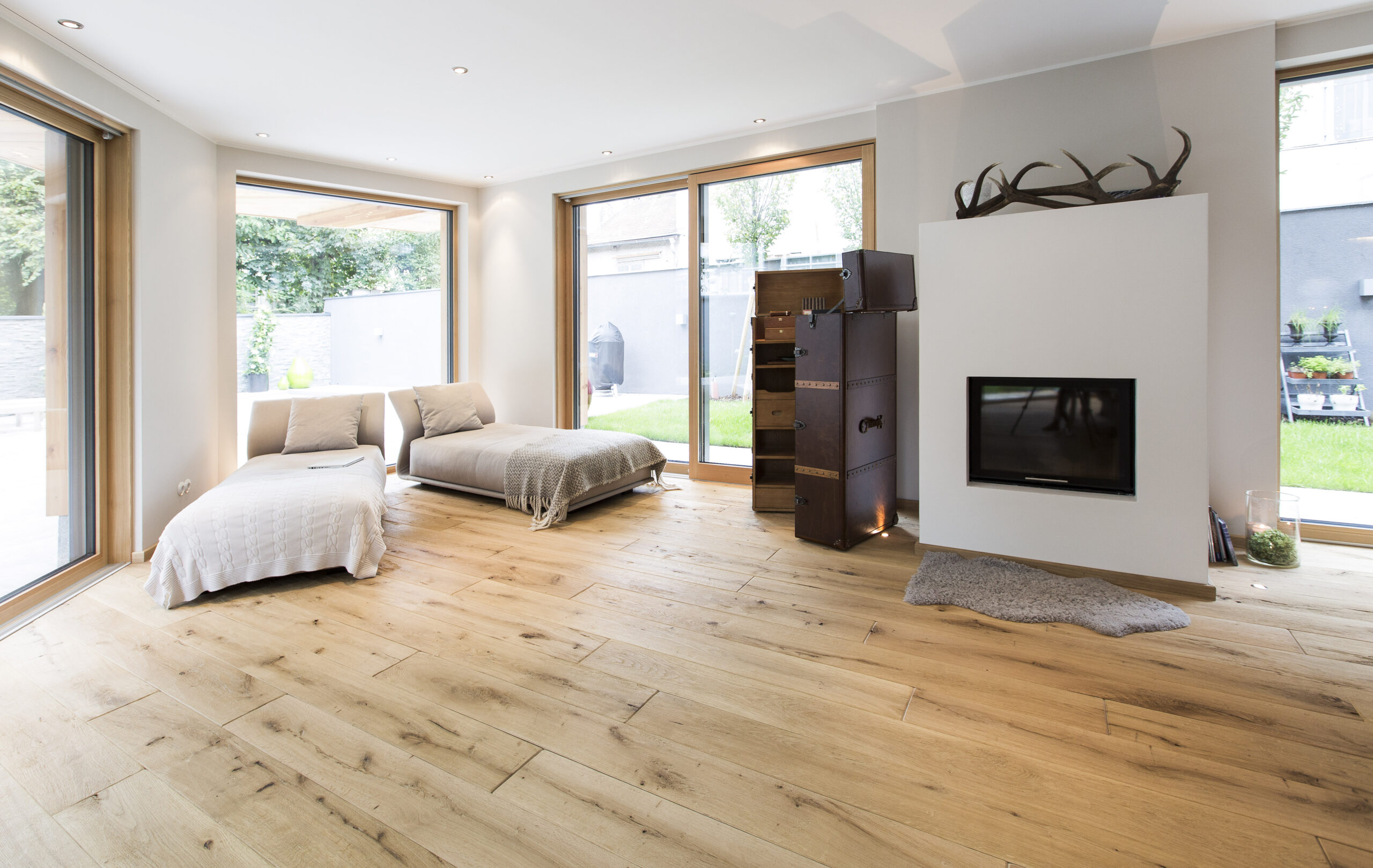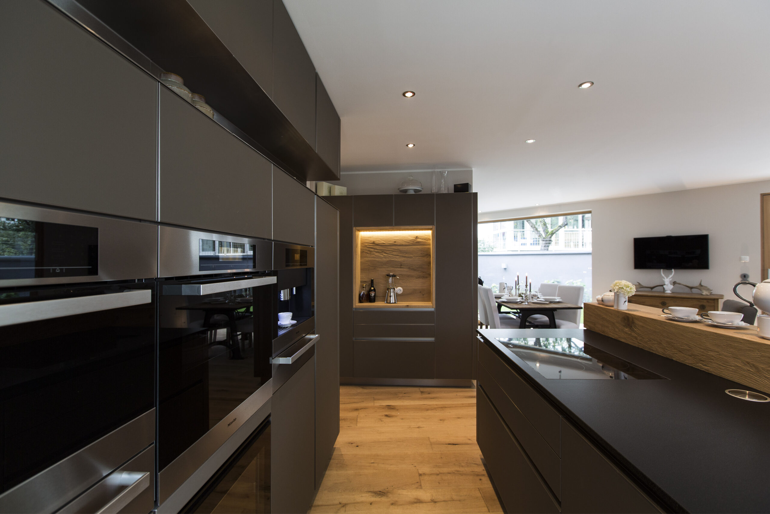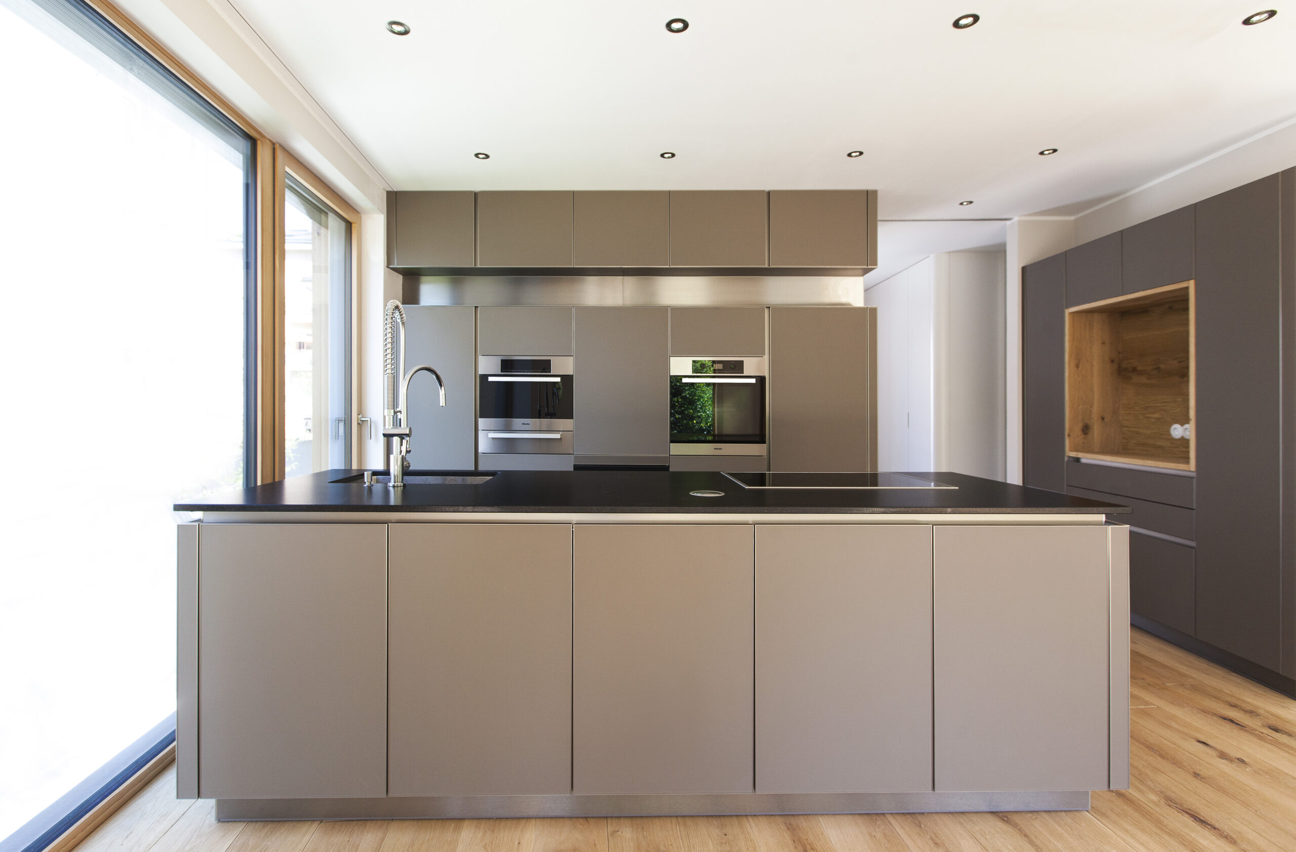 Die Wohnungen im neuen Gebäude verfügen über großzügige Grundrisse mit offener Küche und Essbereich. Großflächige Verglasungen sorgen für Tageslicht und Transparenz, während Vordächer als konstruktiver Sonnenschutz Überhitzung im Sommer reduzieren. Der Eingangsbereich ist hell gestaltet und bietet ausreichend Stauraum. Balkone, Terrassen und ein Pool im Erdgeschoss erweitern den Wohnraum ins Freie.